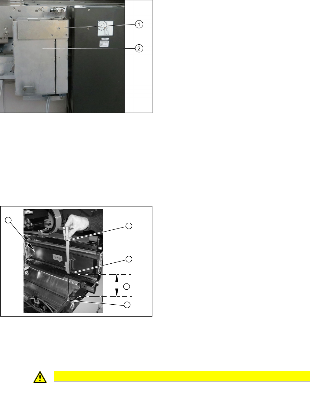 ► Position the measuring scale (1) on the top edge of the X axis lower linear guide (2) and measure