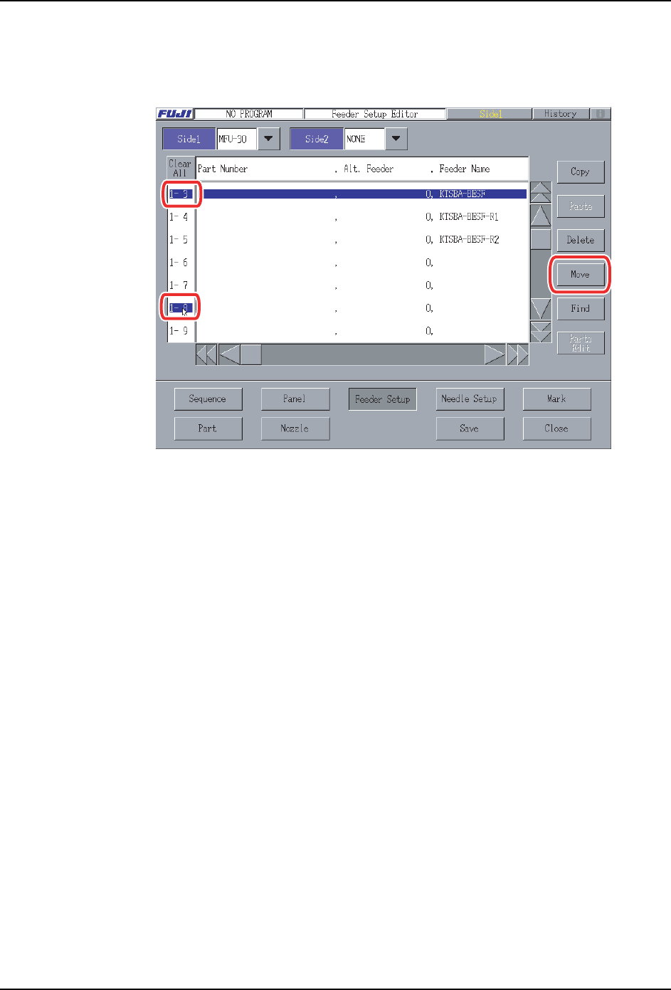1. 请选择进行移动 (更换)的 2 个料槽,按下 [Move] 按钮。在选择传送带式管装供料器