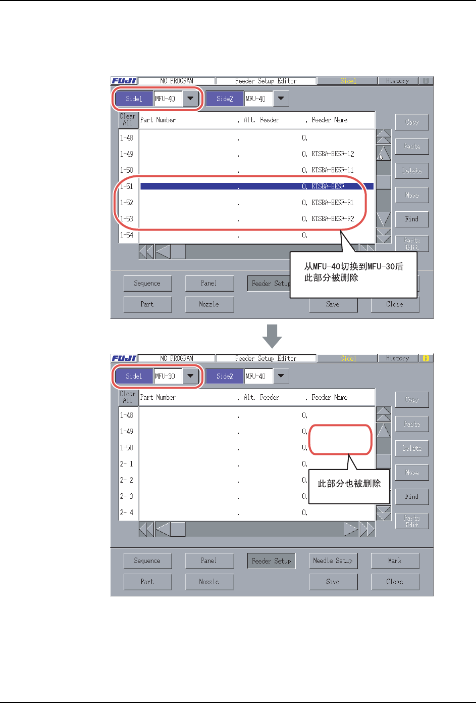 1. 随着料站托架的切换 (MFU-40 → MFU-30),料槽减少 (64 → 50)时,如果在该料槽上