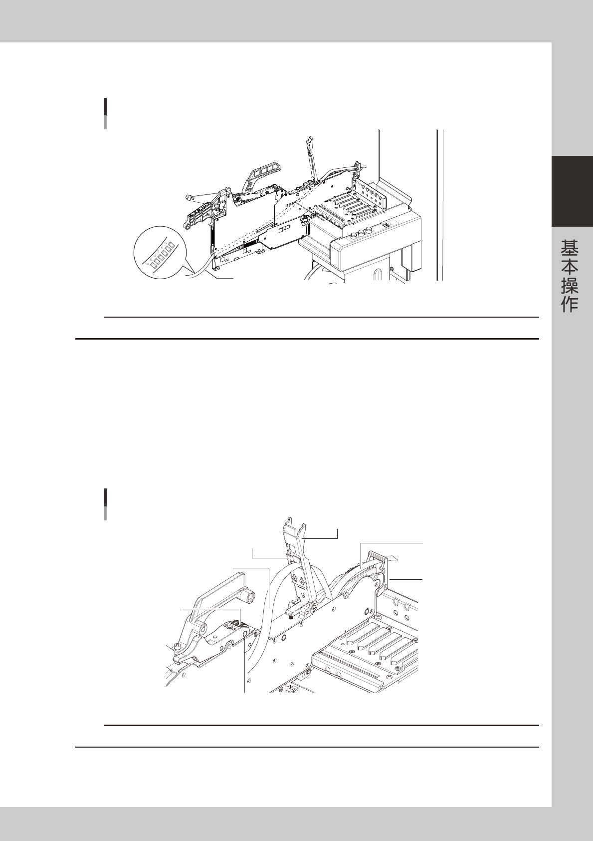 2-38 2 ■ 12mm、16mm、24mm 送料器的压料盖 12mm、16mm、24mm 送料器时,盖带可以不必穿过压料盖的切口部,与 32mm 以上送料器一样穿过前端部也可以使用 ( 即, 采用“前端剥离盖带”的方法 )。 盖带插入口 12mm、16mm、24mm送料器的压料盖 盖带插入口 盖带 压料盖 切口 25206-KMG-00 7 固定压料盖。 确认载带已与链齿轮的齿咬合之后,按下压料盖并用前端压料扣固定压料盖。 固定压料…