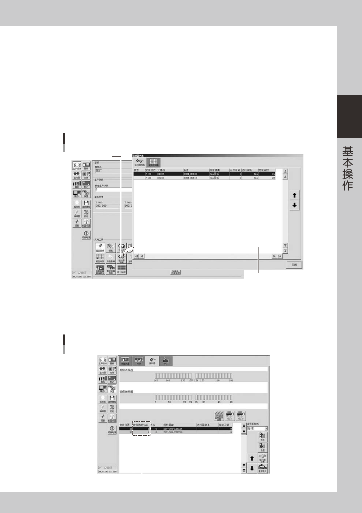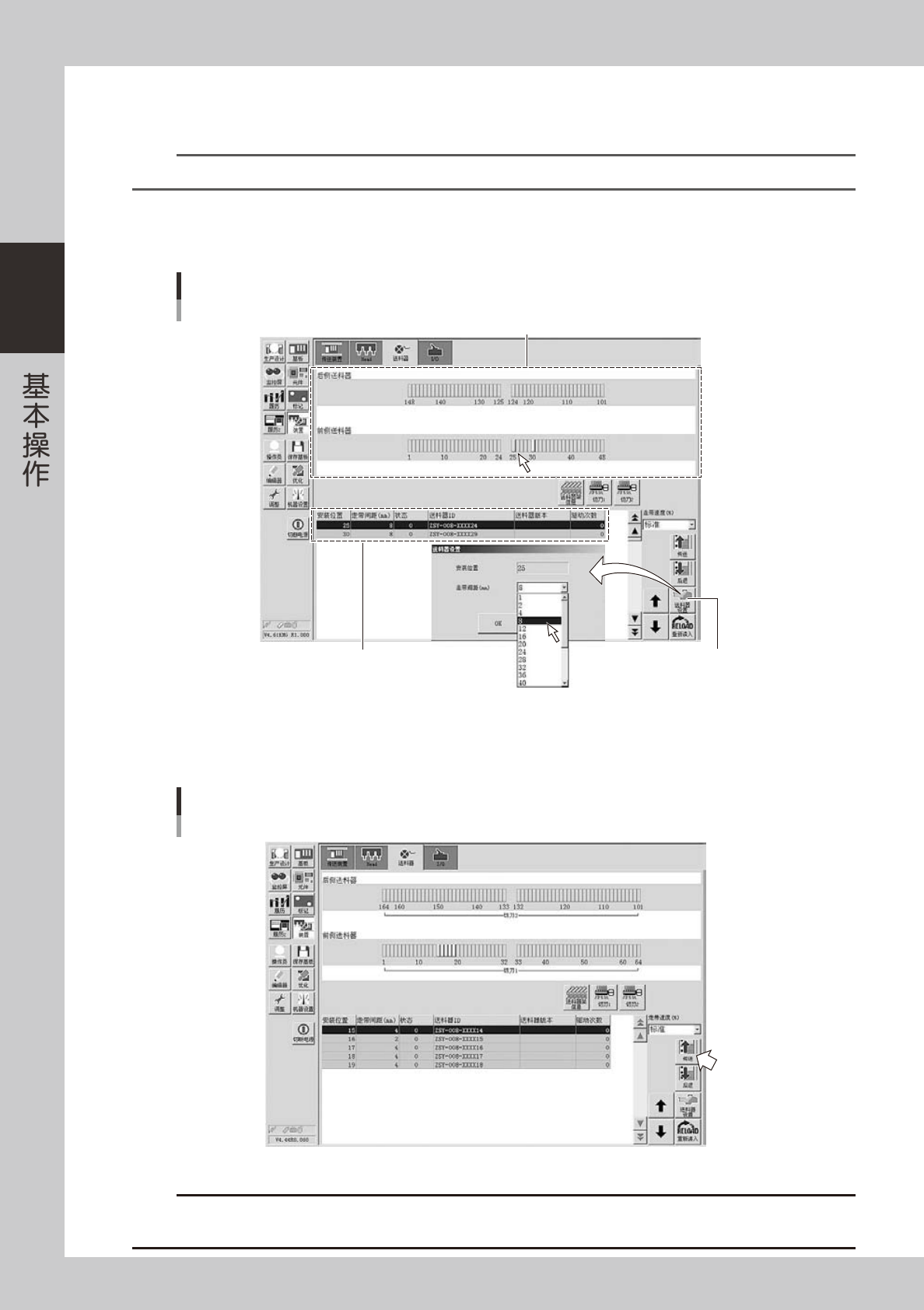 2-50 2 5 打开送料器设置画面。 选择需要设置走带间距的送料器,按 [ 送料器设置 ] 按钮。 参考 可从送料器安装示意图或送料器列表中选择。 6 设置走带间距。 从下拉框中选择适合所安装元件用的间距,按 [OK] 按钮。 设置走带间距 [装置] -“送料器”-“送料器设置”画面 送料器列表 [送料器设置]按钮 送料器安装示意图 26229-KMG-00 5 确认走带状态。 按画面右下方的 [ 传送 ] 按钮,确认料带是否按设置的…