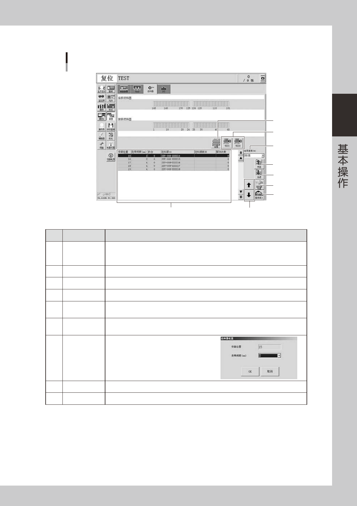 2-17 2 ■ 送料器手动操作画面 “装置”画面 “送料器”选项卡 5 4 3 6 9 8 7 2 1 26209-KMG-00 按钮名 功能 1 送料器信息 显示安装在送料器架上的送料器的相关信息。 “状态”栏里显示的号码为错误编号。 关于错误的内容与解决方法,请参照《SSFEEDER 用户操作手册》与《ZSFEEDER用户操作手册》 。 2 送料器架信息 可以确认送料器架内板卡的版本。 3 切刀 打开或关闭切带机。 …