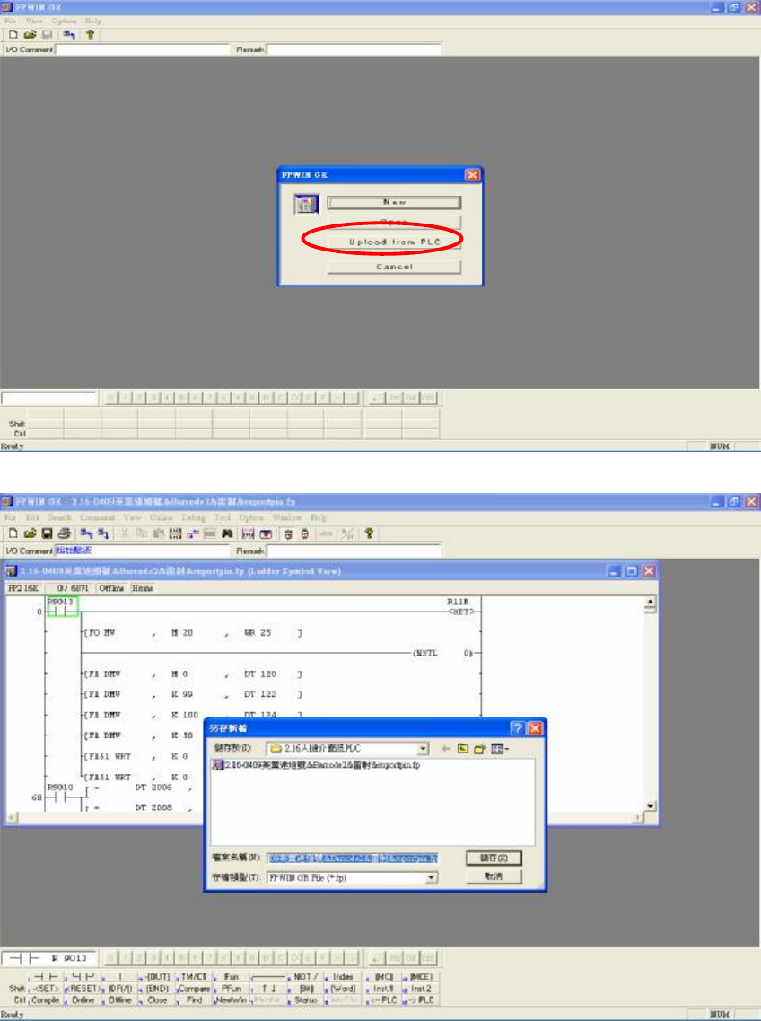 步驟3:進入 FPWIN GR 軟體程式,如下圖所示,點選 Upload from PLC(讀取 PLC 的資料):