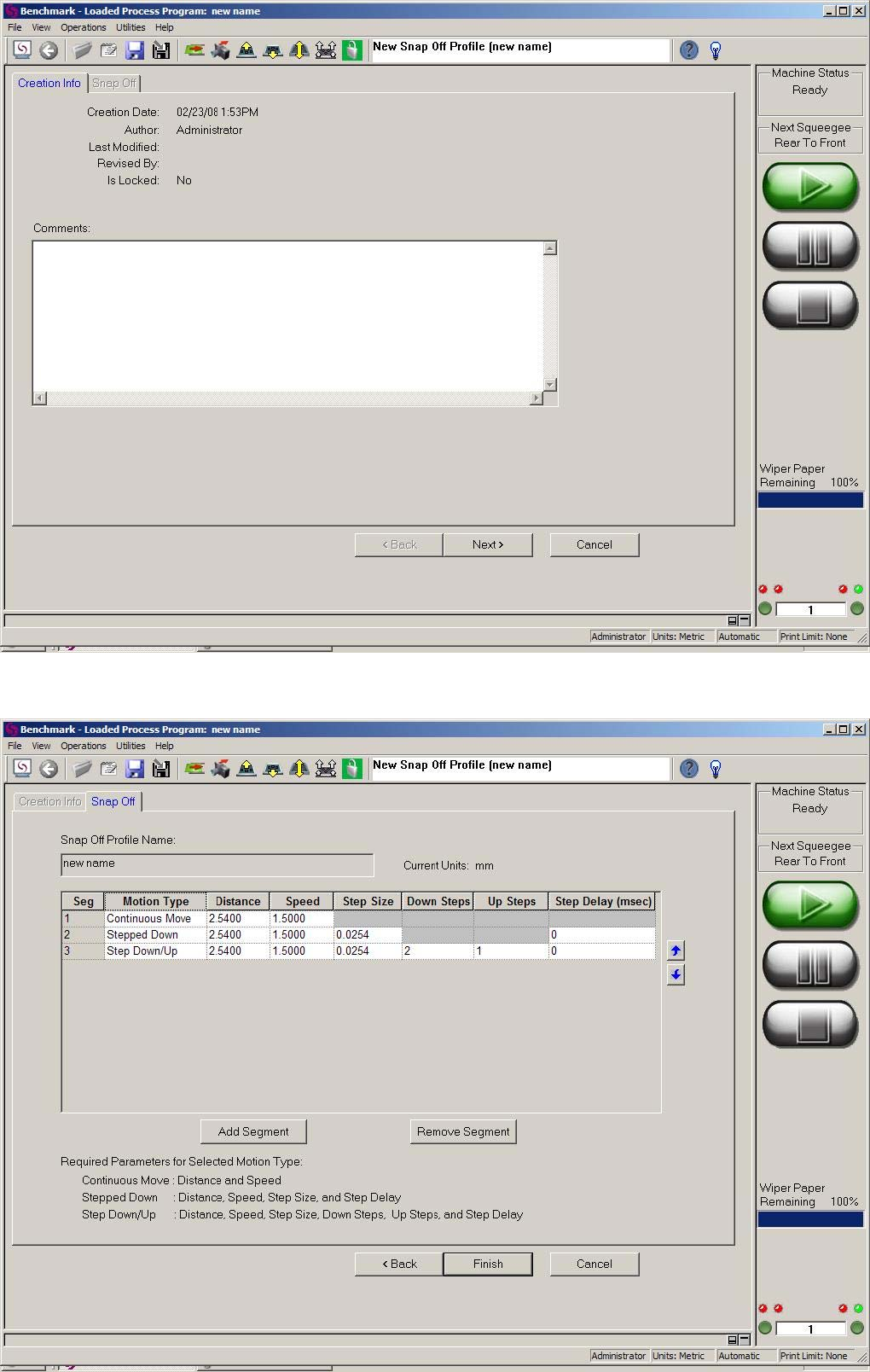 图 -4.9 图 -4.10 4.6.1.2 Cr eation Info : 在 Creation Info 页面可以输入一些与该子程式相关的备注信息,与 Setup Info 页面相同也 与机台动作无关。点击“ Next ”至 Snap Off 页面(图 -4.12 ) 。 Momentum 中文操作说明 2 2 / 6 1