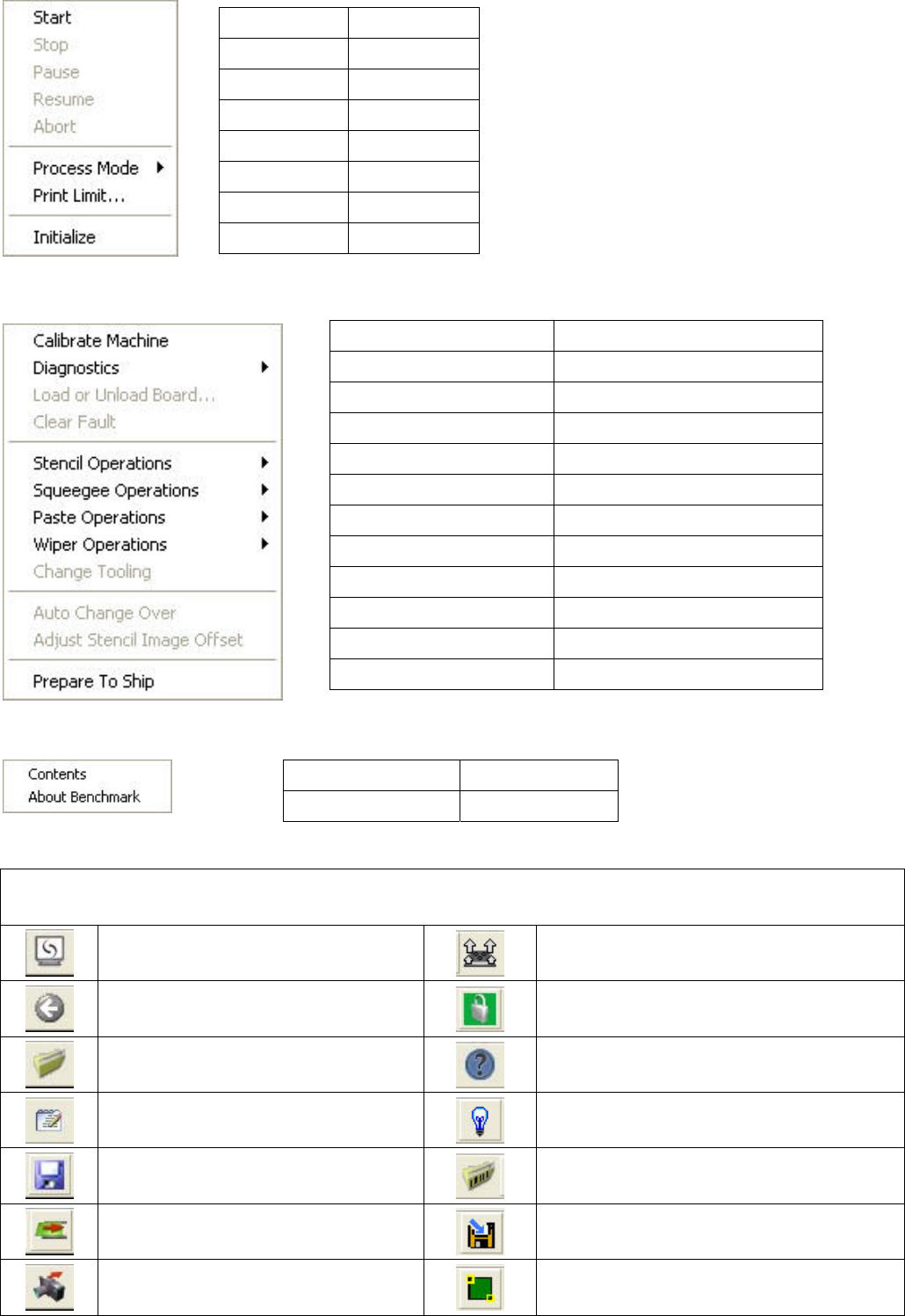 Load S tencil Button 放钢网 Profiles Button 脱模、擦拭子程式 Remove S t encil Button 收钢网 T emplates Button BGA 子程式 Change S t encil Button 更换钢网 Current Page T itle / 当前页面标题 表 -2.2 快捷工具栏(大) Initialize Button 初始化 Add Paste Button 加锡膏…