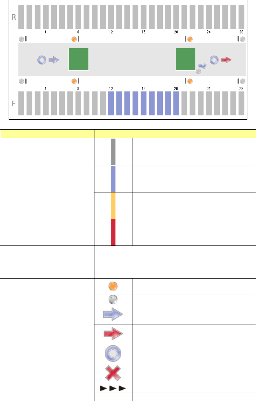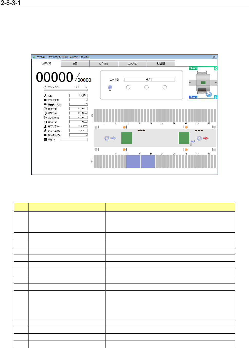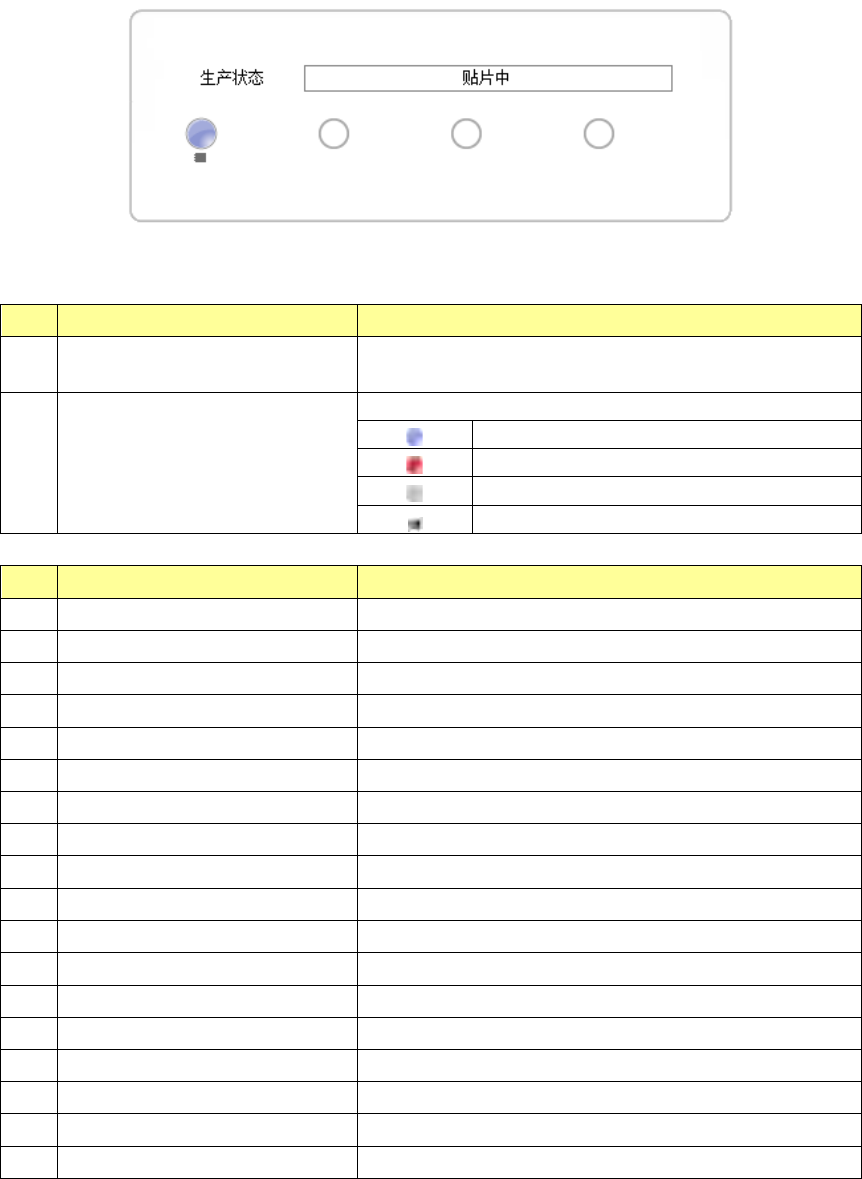 第 1 部 基本篇 第 2 章 生产 2- 43 2) He ad 、台架信息 项目 显示各 Head 、 台架的状 态。 各项 目的内容如下 。 No. 项目 内容 1 生产状 态 显示 当前的生产状 态 的 项目 。 详细情况请参见 下表。 2 Head 显示 显示项目 的 Head 编号。 正常状态 错误状态 未使用状态 元件 吸取 中 No. 显示文字 状态 1 传送动作中 基板 传送 中 2 视图 识别 中 图像识别 元件 的…