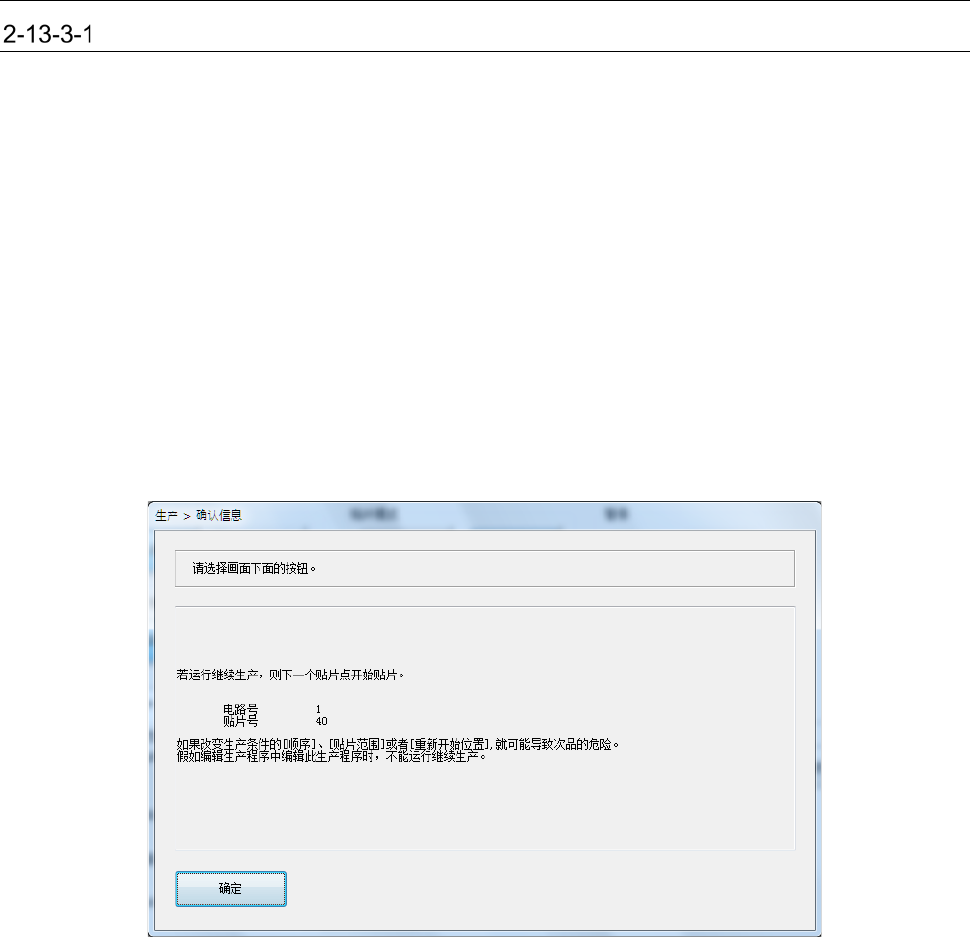 第 1 部 基本篇 第 2 章 生产 2- 11 7 删除继续生产文件 如果 存在继续 生产 文件, 则生产菜单的 [ 文件 ]-[ 删除继续生 产 文件 ] 呈有效状态 。 选择此项 ,即 显示删除 继续 生产文件 的确认 提示信息。 重夹 开始 继续 生产 前, 传送通道上有基板 时 ,即 显示基板重夹 画面。 (1) 提示信息 显示传 送通道的状 态、重夹 / 搬入基板 的注意事项、 执 行后的 动 作等内 容。