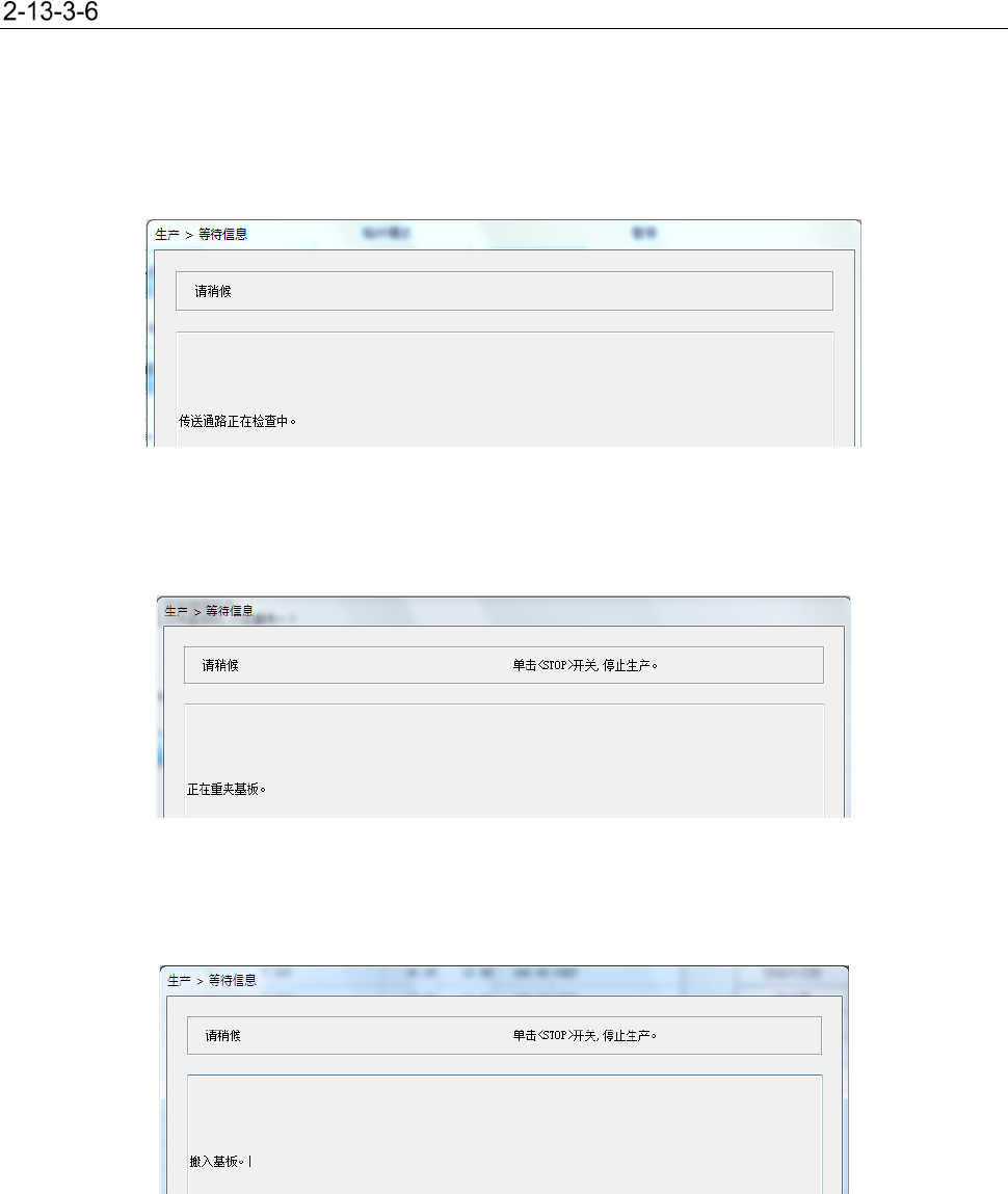 第 1 部 基本篇 第 2 章 生产 2- 122 重夹的执行信息 在重夹 画面中按下 < ST AR T > 按钮 开始生 产 后,会开始 进 行各项检查 。 (1) 在重 夹动作或基板 搬出 动作前,或 新建 生产 前,要 检查各传 送通道( IN, W AIT , C - OUT , OUT )上 有无基板。此时 ,会显示 传 送通道 「检查中」 、要求等 待的提示信 息。 (2) 在重夹 画面的 生产 开始前 处理项…