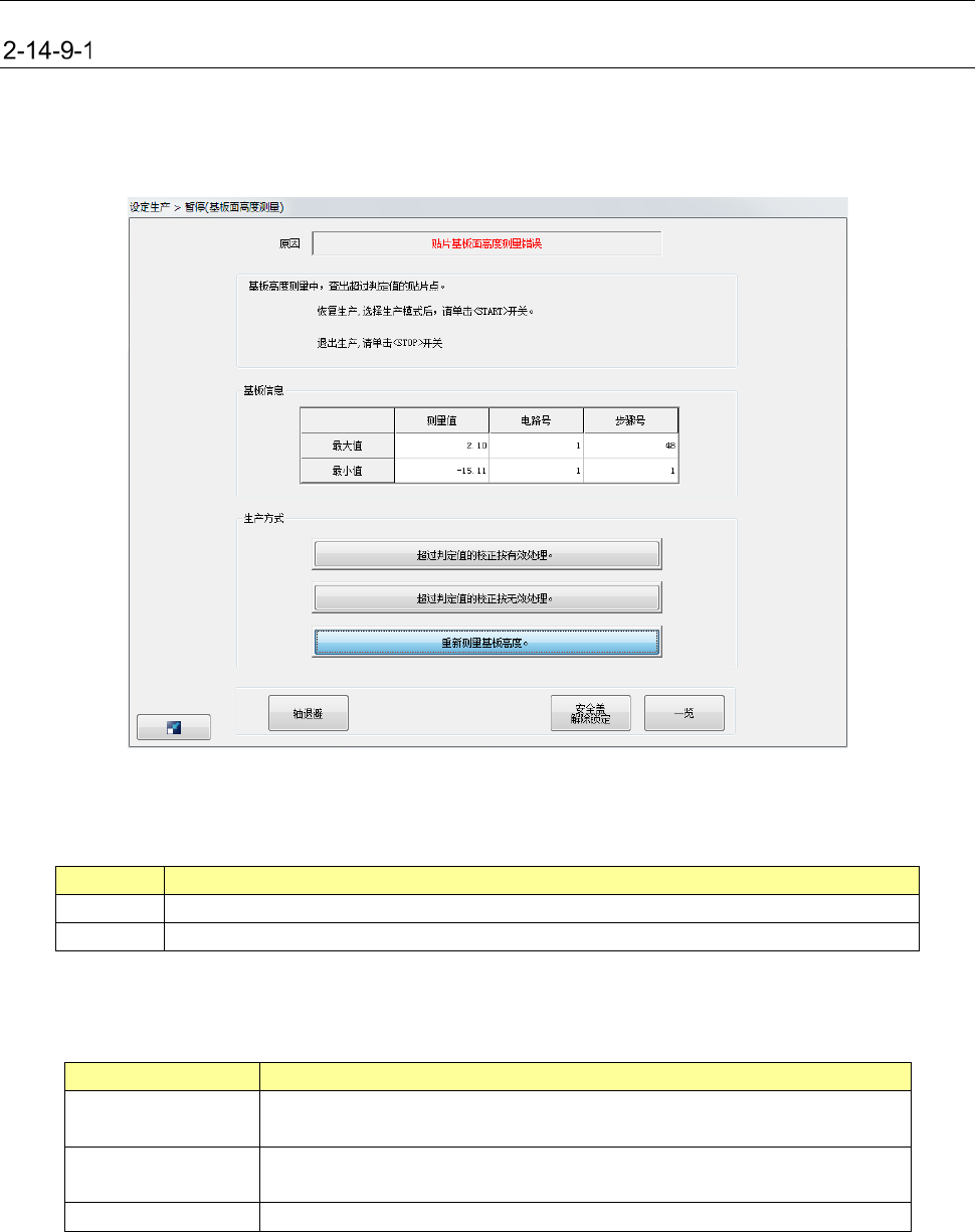 第 1 部 基本篇 第 2 章 生产 2- 147 2- 14 - 9 贴片基板面高度测量 搬入基板后的基板高度测量 在操作选项 勾选了 [贴片基板面 高度测量 ] 时,在 生产中测量贴片 基板面高度 。 操作 选项 的 [ 在贴片前 测量 贴片 基板高度 ] 为 无效 时, 则在 基板搬入 后统一 进行测量。 发生测量错误时, 显示下图 并成为 暂停状态。 (1) 基本 信息 显示 基板面 高度测量的 最大 值与最小值。 项目 内容 …