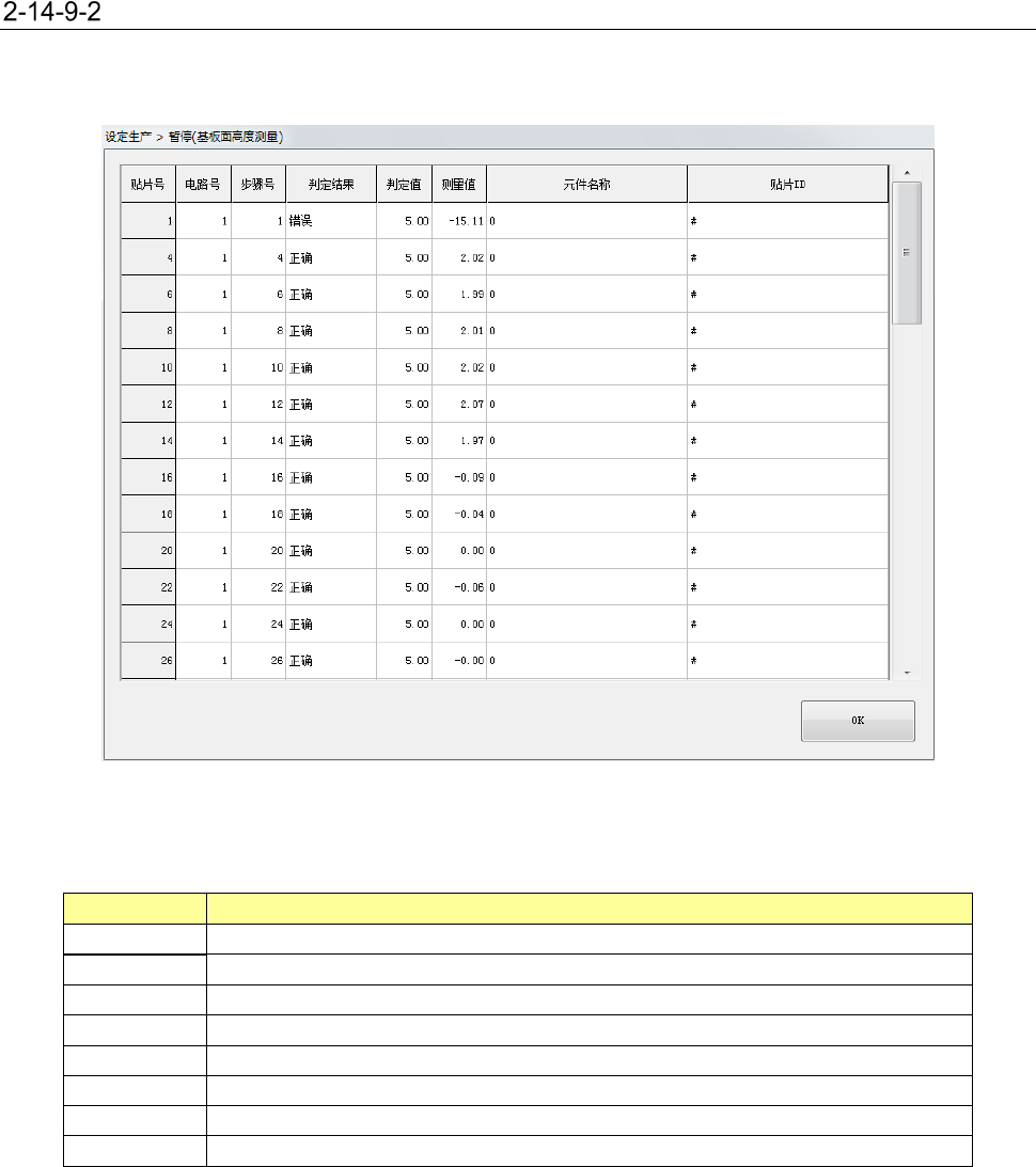 第 1 部 基本篇 第 2 章 生产 2- 150 贴片前的基板高度测量 操作 选项 的[在贴 片前 测量贴片基板 高度]为 有效时,在贴片 前测量。 发生测量 错误 时,显示下 图 并成为 暂停 状态 。 (1) 基本 信息 显示发生 错误 的贴 片点的 信息。 项目 内容 元件名 显示发生错误的 贴片点的元件 名。 贴片 ID 显示发生错误的 贴片点的贴片 ID 。 判定值 显示发生错误的 贴片点的判定值。 测量值 显示发生错误的 …