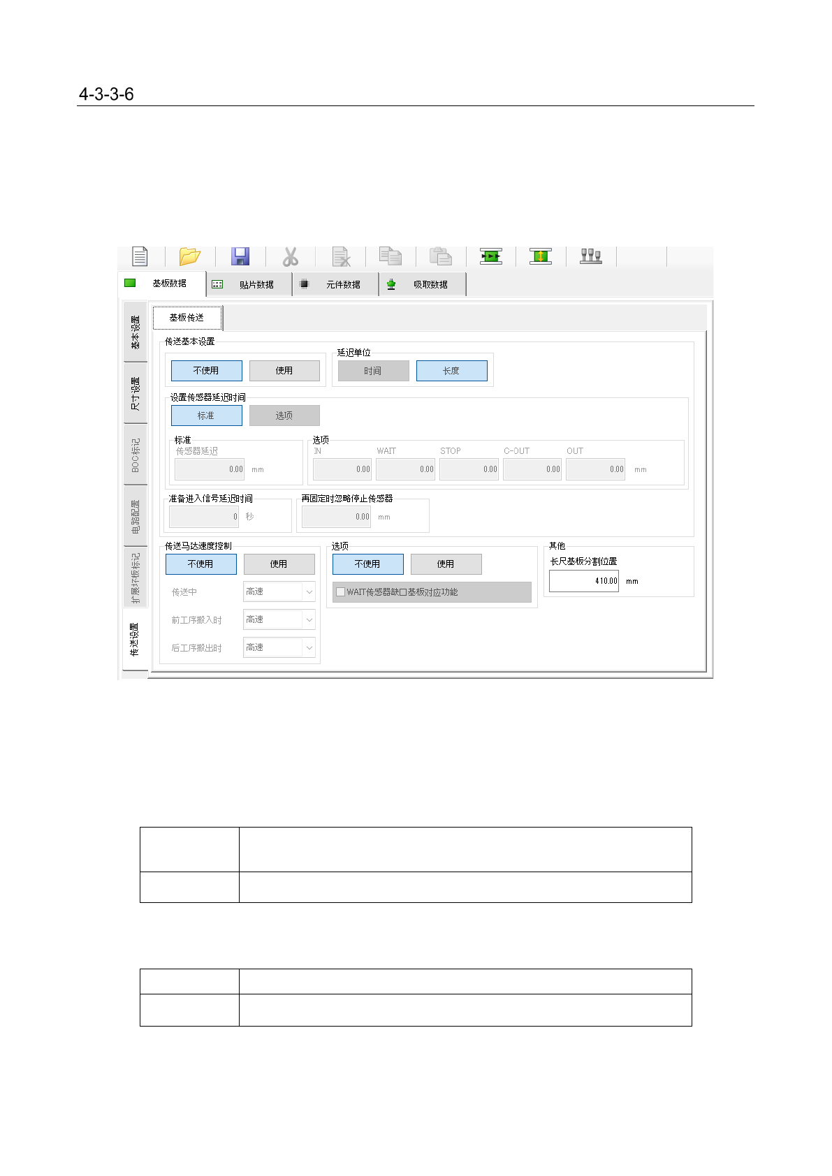 「基板设置」选项卡由“传送基本设置”、“传送马达速度控制”、“选项”、“其他”组构成。
