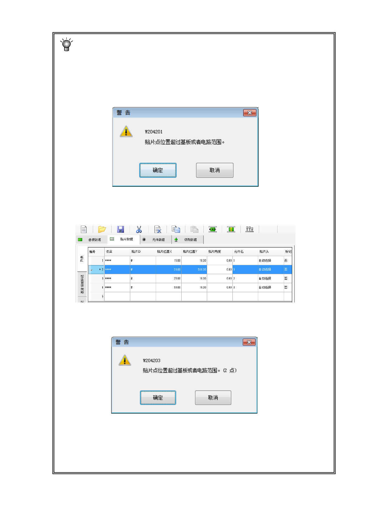 在输入贴片位置 X 或 Y 时,或分别进行了改变时,将进行范围检查。