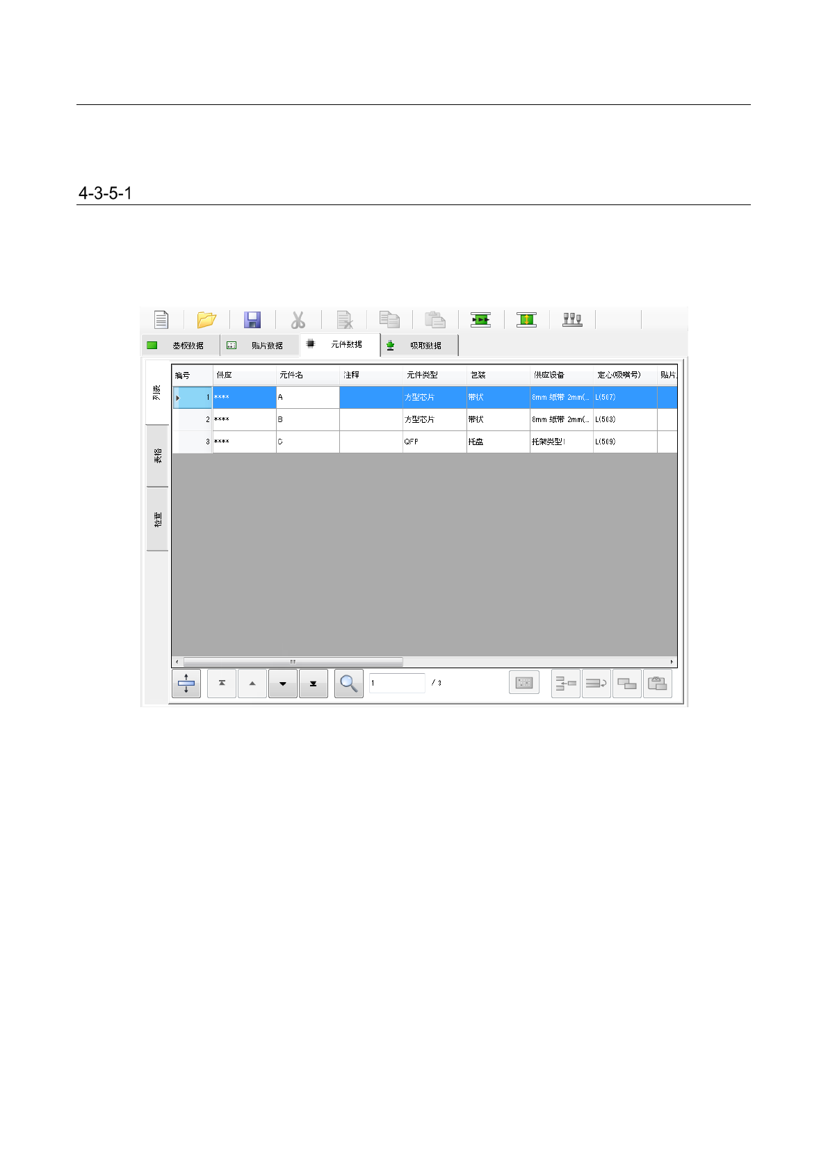 「元件数据」,是针对在「贴片数据」中输入的“元件名称”输入详细的信息数据。