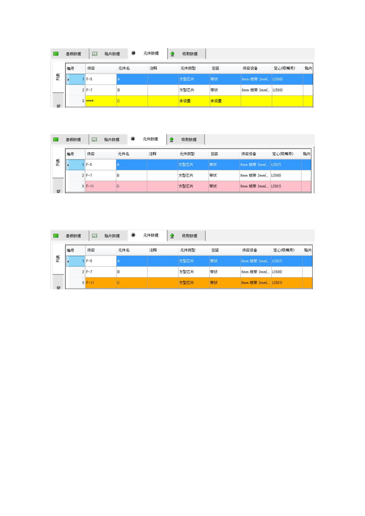 元件数据中设置的元件名,如果在贴片数据中没有使用时,项目会以粉红色显示。