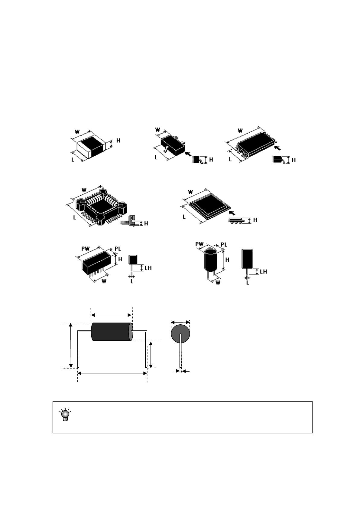 例>W = 外形尺寸 横 L = 外形尺寸 纵 H = 元件高度 LH =管脚长度