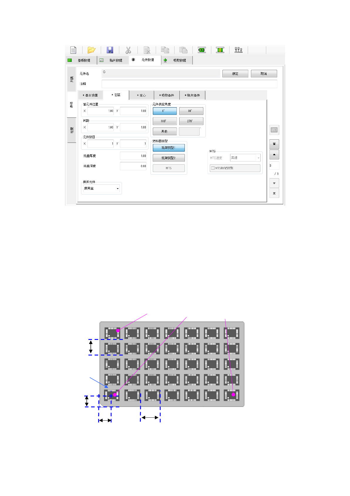 托盘元件的首元件中心位置尺寸(X、Y) : 输入托盘外形起的尺寸。