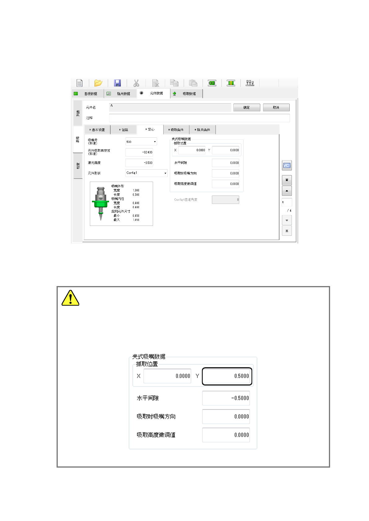 例) 为 800 号吸嘴时 : 设置 800 号吸嘴的抓取位置 Y:0.5。