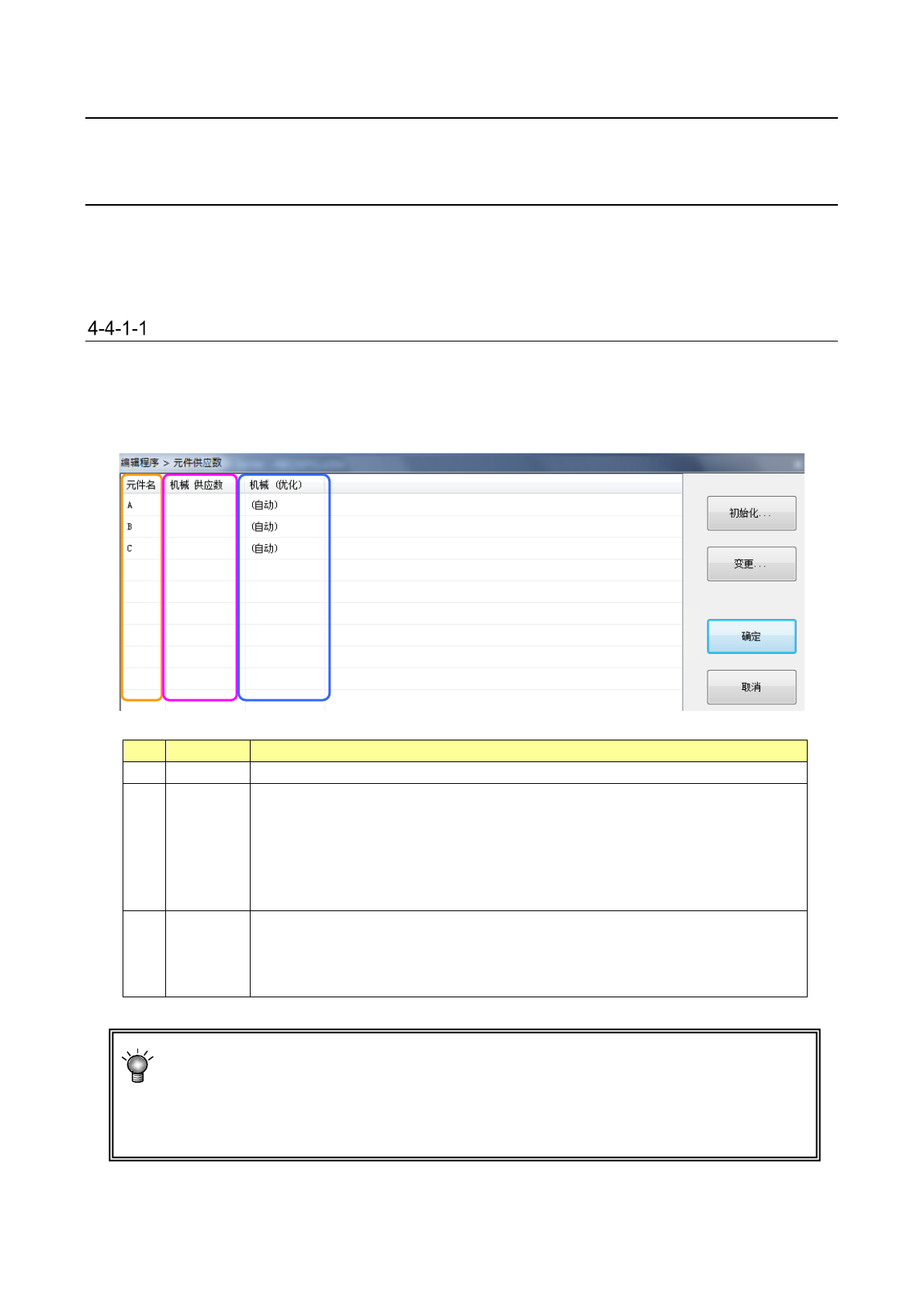 第 1 部 基本篇 第 4 章 制作生产程序 4- 11 5 (1) [ 初始化 ] 按钮 将全部元件的供 料器供应数设置为 [ 自动 ] 或 [ 最小供应数 ] 。 设置项目 内 容 自动 自动对所有元件 的供应数进行初始化。 当为自动时,可 设置增加供料器的上限 ( 默认为 24) 。 最小供应数 执行所有元件供 应数的每一种元件吸取数 据总数的 初始化。 上限值作为默认 值使用 将上限值的设置 登录为默认值。 制作新程序时作 为默…