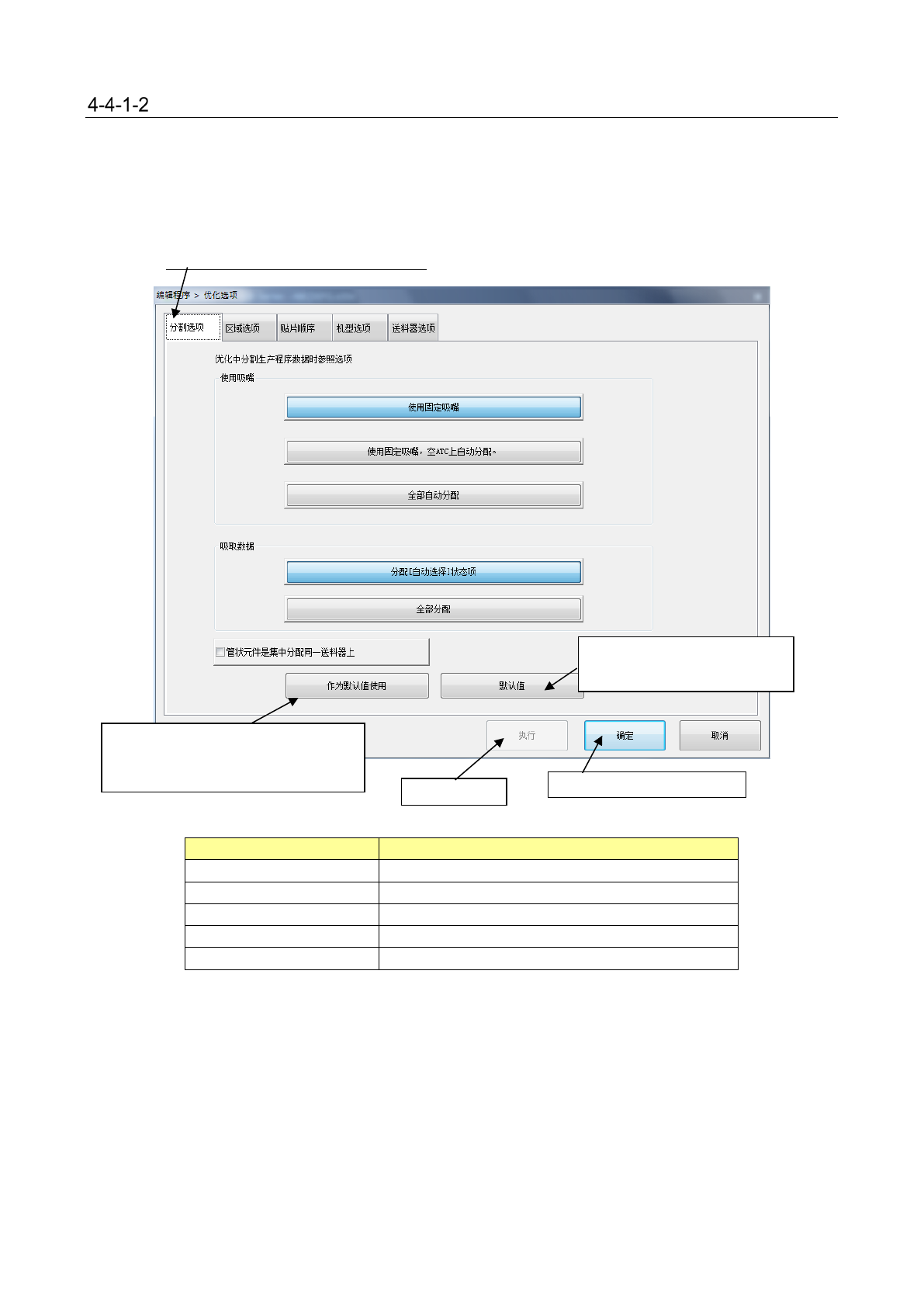 分割选项 设置分配吸嘴及吸取数据时的优化参照选项。