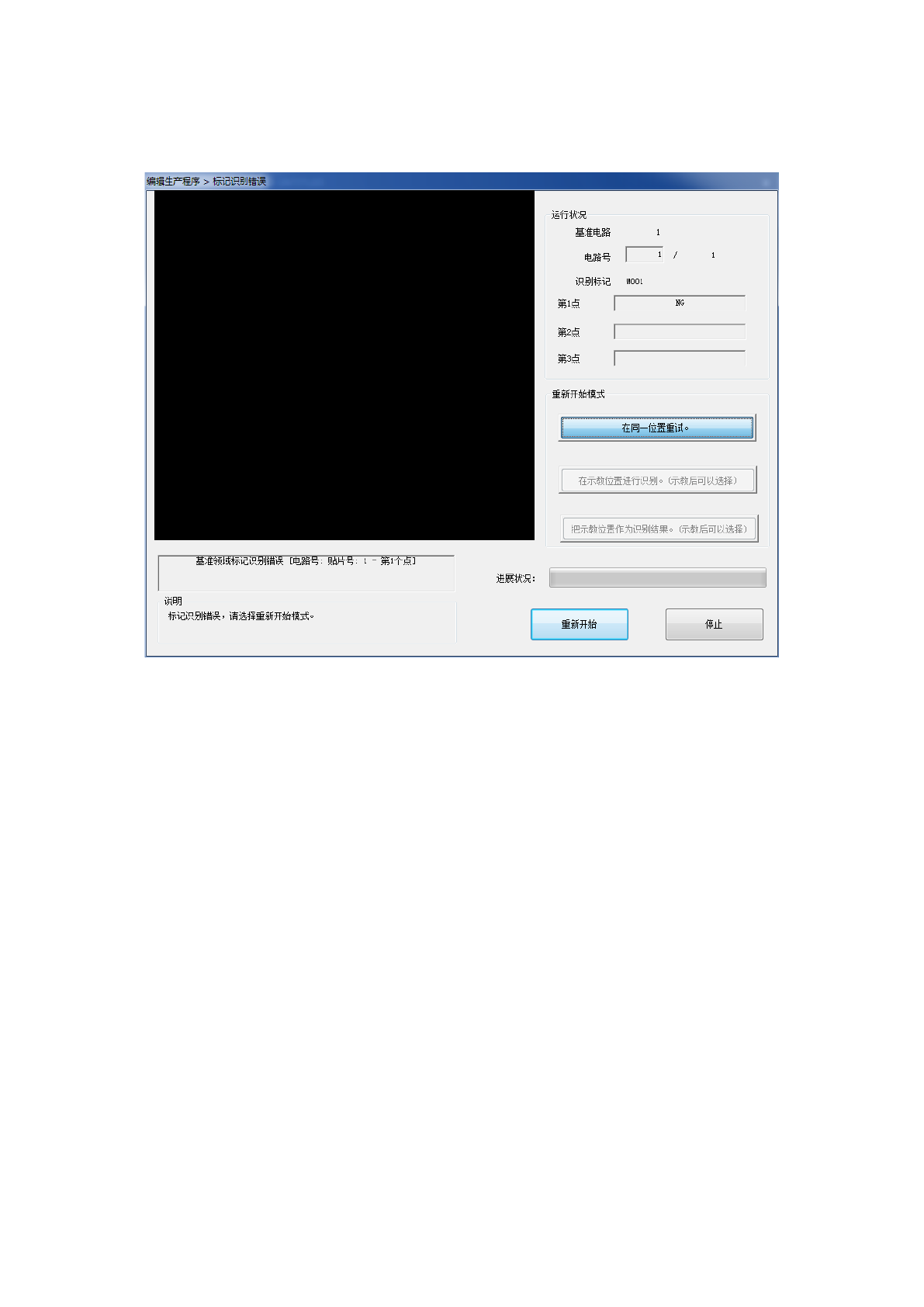 当执行基准领域标记识别失败时,会在画面的“说明”栏中显示提示信息,可以选择“重新开始