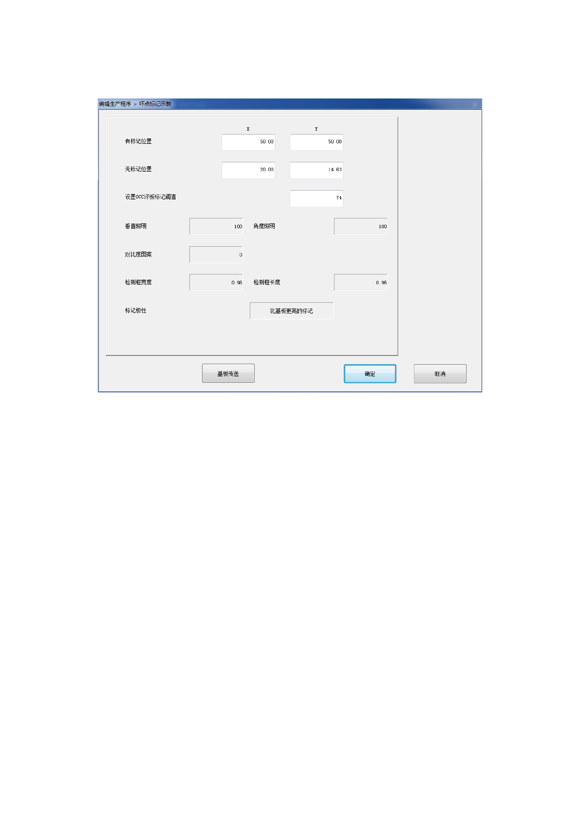 在 OCC 坏板标记阈值设置中使用示教对有标记位置及无标记位置进行识别动作,成功取得阈