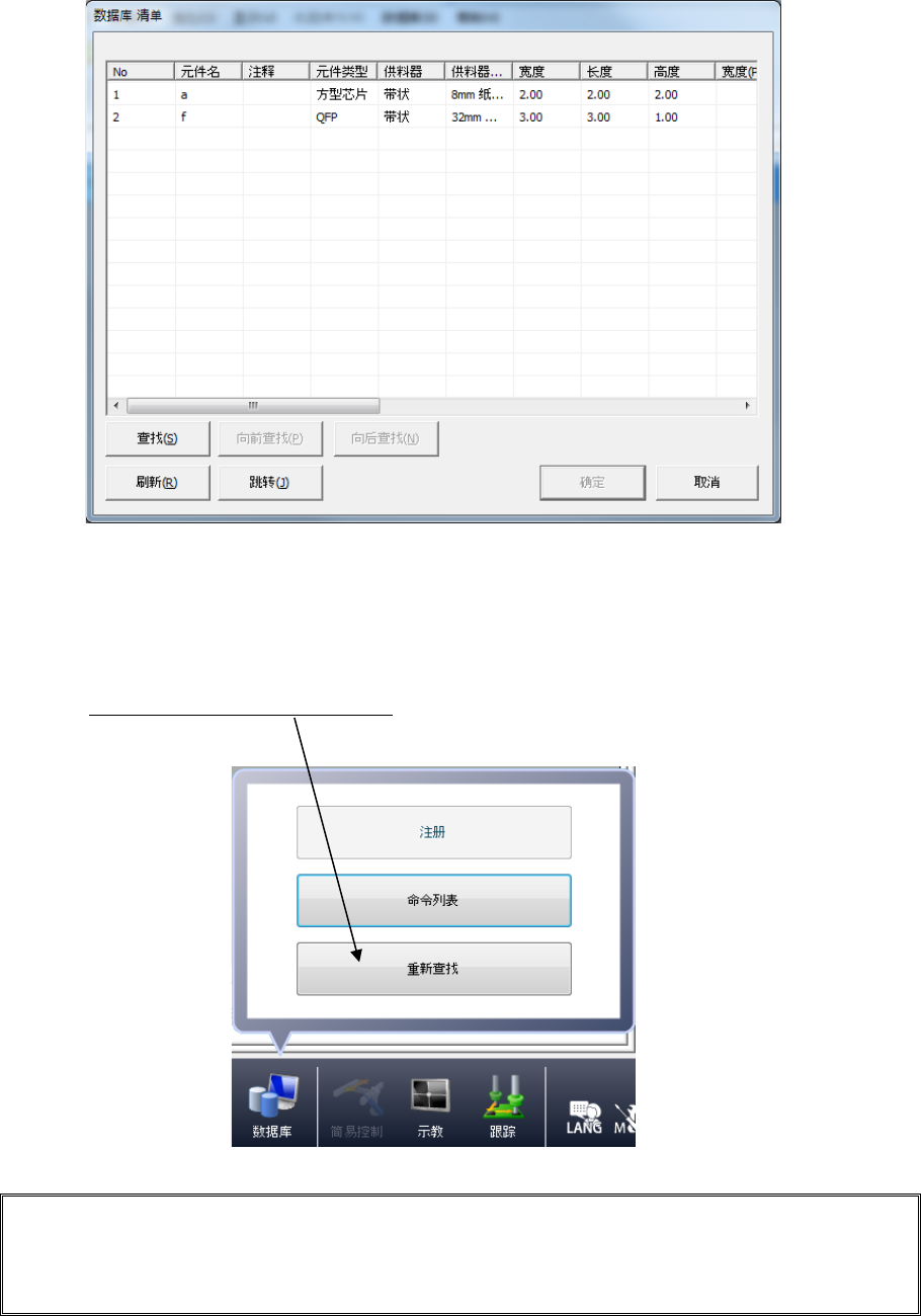 库中调出,注册到生产程序的元件数据中。每执行一次“重新查找”,即对贴片
