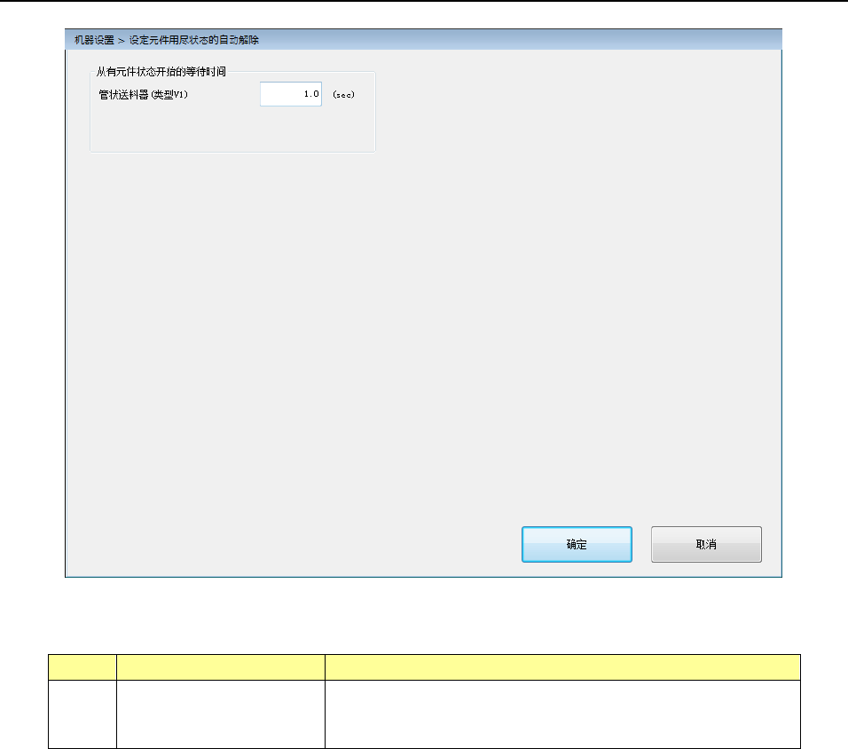 第 2 部 功能详解篇 第 7 章 机器设置 7- 41 7-3-5- 7 设置元件用尽状态自动解除 (1) 设置项目 ( 对各设定值推 荐使用默认 设定值 ) No. 项目 设置内容 1 从有元件状态 起的 等待 时间 设定从元件有 无传感器 成为 「有」 的状态之后, 到 元件 装 满结束间的时间 。 (2) 设置方法 各时间以秒 为单位,输入 0 .1 ~ 20 .0 的数值,进行 设置。