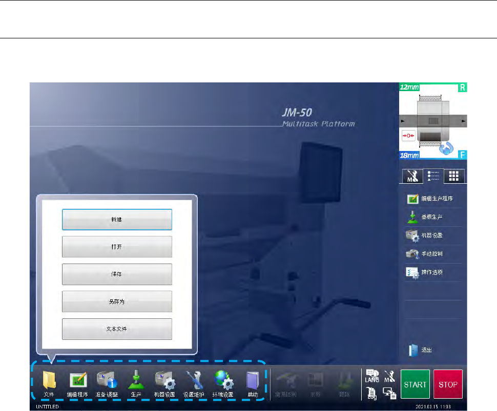 第 1 部 基本篇 第 1 章 装置概要 1- 47 1-8- 3 操作方法 1-8-3- 1 选择命令 选择操作区域的 菜单 ( 蓝点线框内 ) ,可选择命令 。 上图为在主画面 中选择 [ 文件 ] ,显示子菜单 的示例 。 从子菜单内选择 任意命令 按钮,即 可执行命令 。 上述 主要命令的执 行方法:按 信息区域里的 菜单快捷按 钮,即可执行 命令 。 如果应用程序在 执行过程中, 必需先退出 执行中 的应用 程序,才 能执行选…