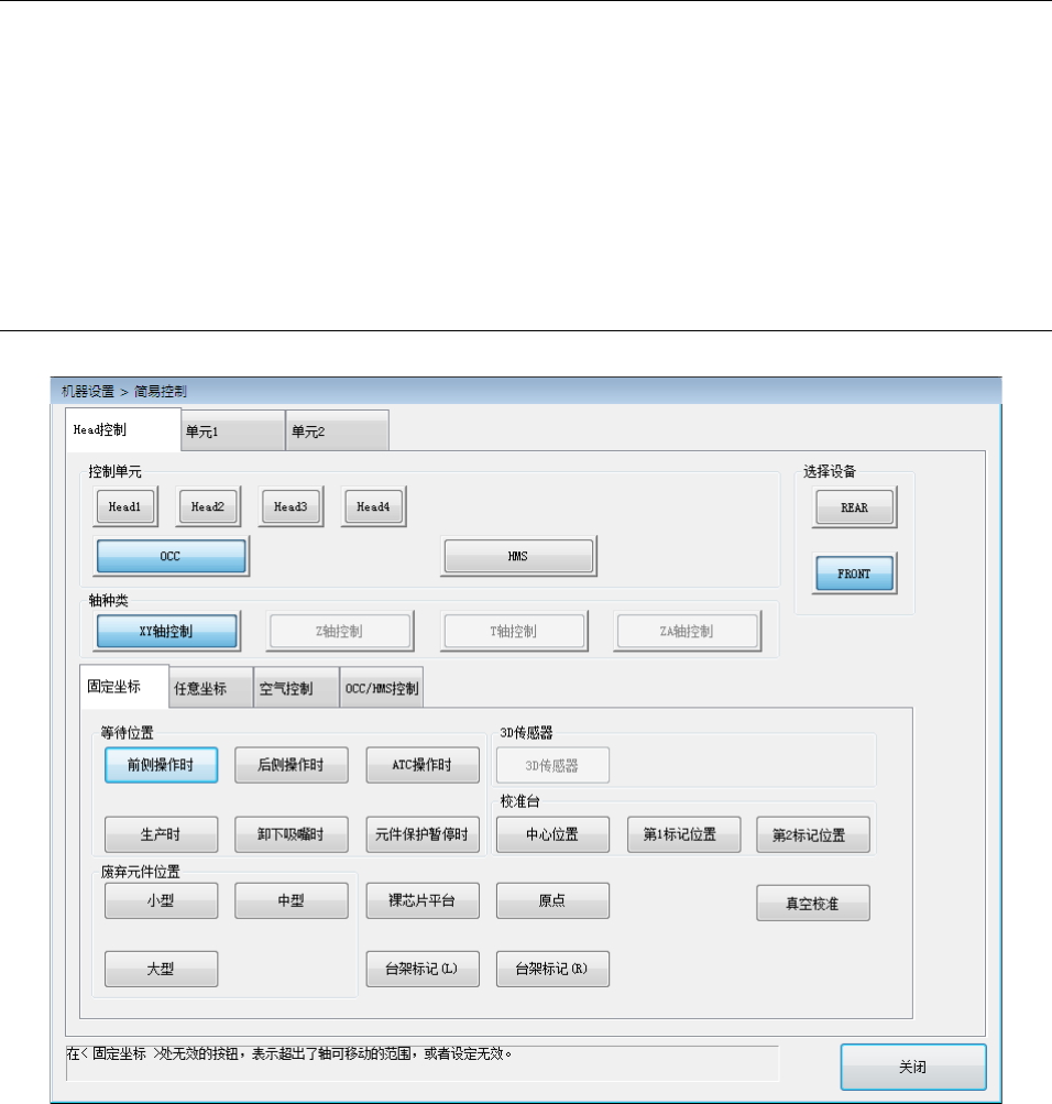 第 2 部 功能详解篇 第 7 章 机器设置 7- 55 7- 4 简易控制 从手动控制、机 器设置、自动校准的操作区 域选择「 简易控制」 ,即可打开以 下简易控制 的主画面。 主画面中有 [Hea d 控制 ] 、 [ 单元 1] 、 [ 单元 2] 选项卡,在 [H ead 控制 ] 选项卡中可使用 [ 选择设备 ] 按钮、 [ 控 制单元 ] 按钮与 [ 轴类型 ] 按钮移动指定的控 制单元, 进行 Head 吸嘴的空气控 制、…