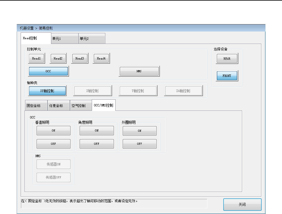 按下 [垂直照明] [角度照明] [外圈照明]的 [ON] [OFF] 按钮,即对OCC进行照明控制。仅外圈照明