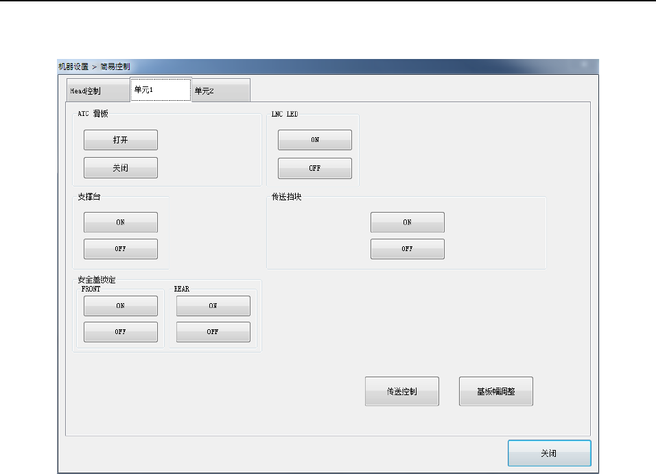 第 2 部 功能详解篇 第 7 章 机器设置 7- 63 7-4- 6 单元 1 可对 ATC (滑 板)、支撑台 、安全盖锁 定、 LNC L ED 、 传送挡块、传 送、 AWC 进行控 制。 (1) AT C 的滑板 可进行各 AT C 的滑板「 OPE N / CL OSE 」 控制 。 (2) 支撑台 可进行支撑台的 「 UP / DOWN 」控制。 (3) 安全盖锁定 可执行前 / 后的「安全盖锁定 ON /OFF 」。 (…