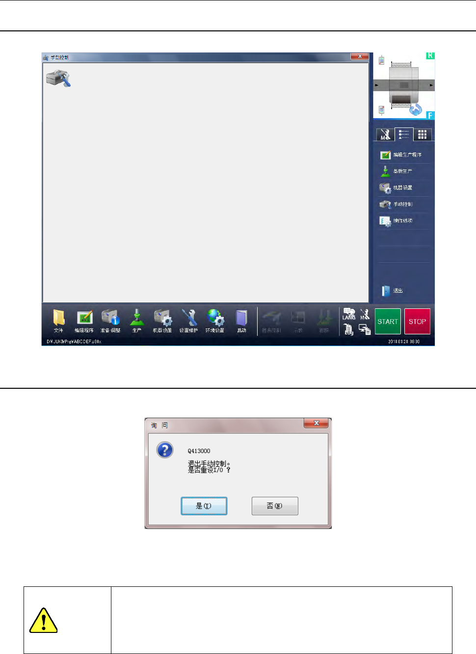 第 2 部 功能详解篇 第 8 章 手动控制 8-2 8- 2 手动控制的启动 与退出 8-2- 1 启动手动控制 从菜单选择 [ 维护 ] → [ 手动 控制 ] ,即可 显示如下 的手动控制初始 画面。 8-2- 2 退出手动控制 在信息区域选择 [ 退出 ] ,或按下画面右 上的关闭 按钮 [ × ] , 即可退出手动控制 。 「是」: 执行 I/O 安全方向设 定之后退出。 例如, Head 有吸嘴时,应 把吸嘴返回 ATC 后…