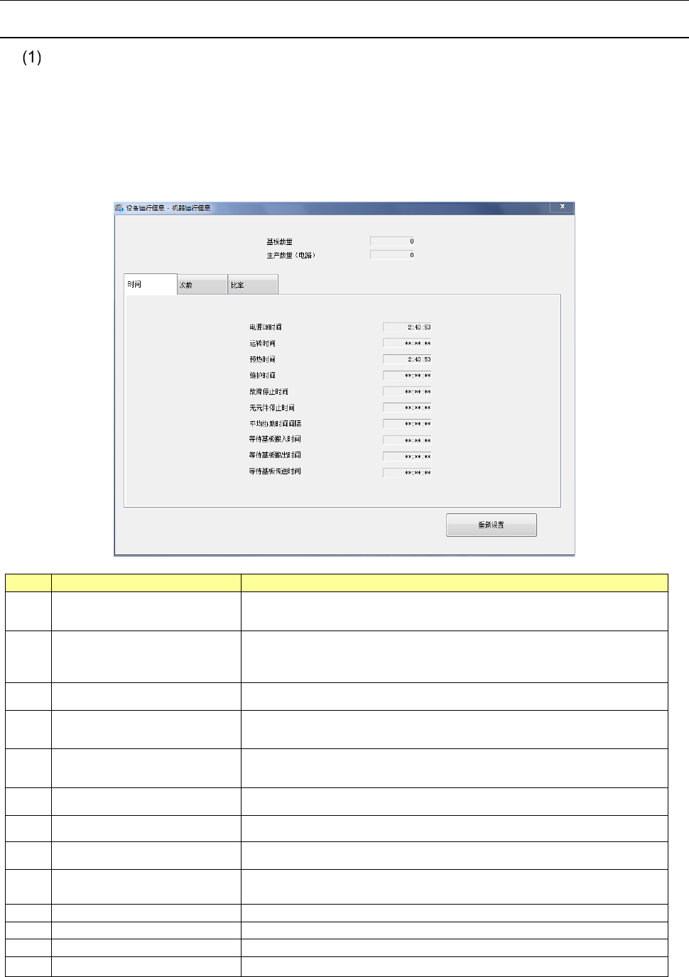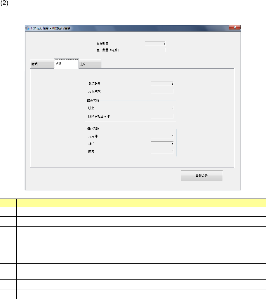 显示机器的运行时间(基板生产时间的累计等),吸嘴拆装次数等设备固有的运行信息。