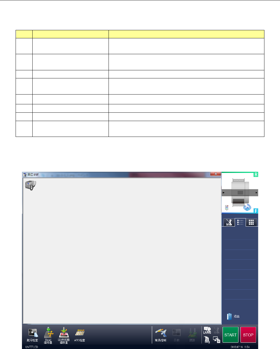 第 2 部 功能详解篇 第 10 章 自己诊断功能 10 -5 10 -3- 3 个别诊断功能 个别诊断功能是 指,按动作项目进行装置 诊断的功 能。 个别功能的诊断 项目,列举如下。 No. 个别诊断功能组 设定内容 1 Cal 块标志 沾污检查 检查 Cal 块标志 上 有无夹具 或部件遮挡 标记 , 确保返回原 点时坐标系不会 出现误差。 2 过滤器沾污 检查 对 Head 的真空 ON/OFF 按规定次数执行 检查 , 检查喷射…