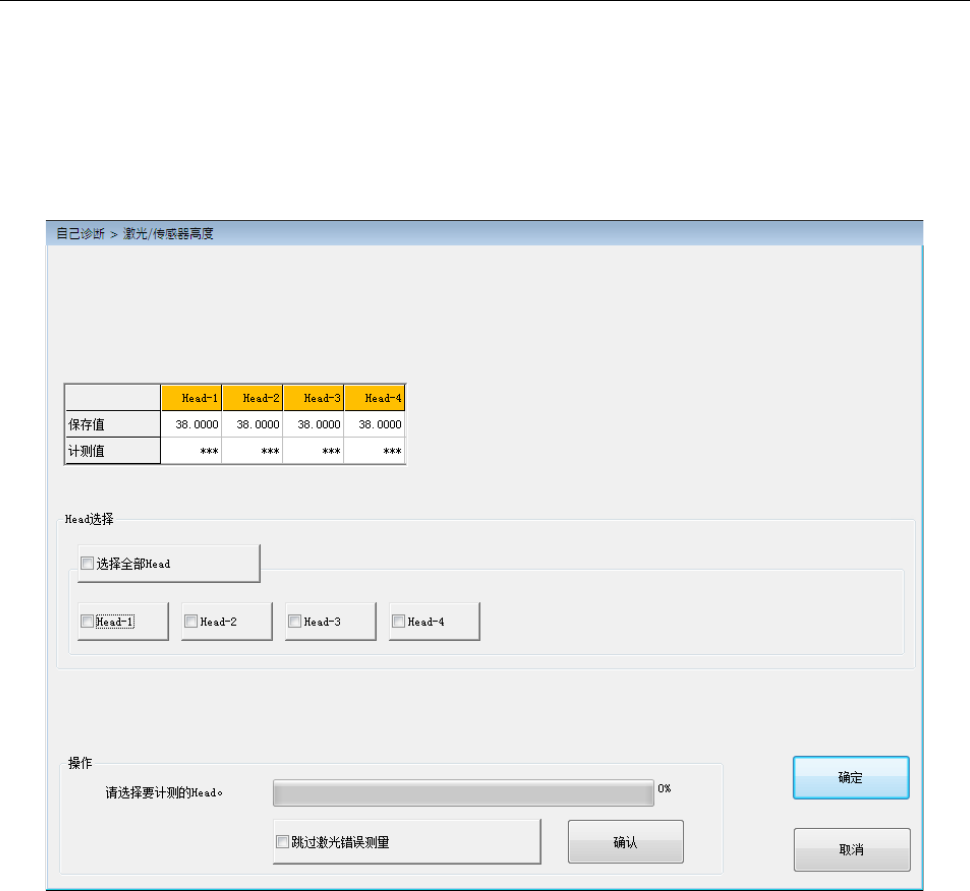 第 2 部 功能详解篇 第 10 章 自己诊断功能 10 - 15 (3) 操作 1) 进度条 显示测量的经过 。 测量结束后 变为 100% 。 2) 跳过激光错误测 量 勾选 [ 跳过激光错误 测量 ] ,按 [ 确认 ] 按钮,即跳过 激光错误 。 激光识别错误、或测量 结果在规定 范围以外时不会 显示询问提示而 显示 ”Err” ,之后如果对象 He ad 单元 内有未 测定的 Head ,即进行该 Head 的测定动作 。 如…