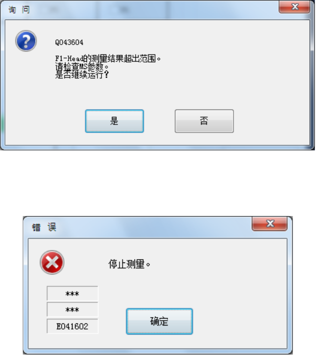 第 2 部 功能详解篇 第 10 章 自己诊断功能 10 - 17 激光识别错误及 计测结果处于规定范围以 外时,会 显示以下提示信 息。 激光识别错误及 计测结果处于规定范围以 外时的 以外 错误, 在显示对象错误 提示后, 会显示以下提 示信息,按下[ OK ],即 使有未 测定的 H ead ,也会停止 测定动作 。 (4) 计测结束 计测结束后,进 度条会变为 100% ,计测值 会显示蓝色 字符 。 按下 [OK] 按钮,计测…