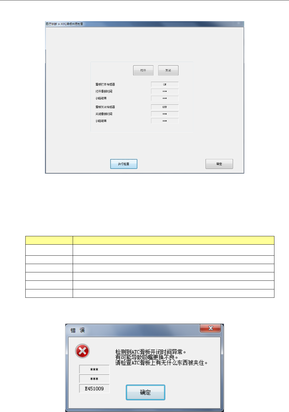 ATC 滑板开闭检查出现错误时,会输出如下信息。