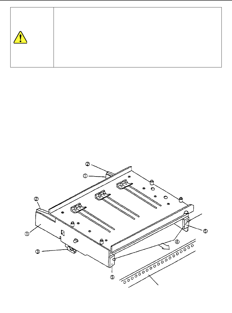 3) 在销④插入且前板⑤顶住固定板的位置上,放开边板①和锁紧杆②,用锁紧支架③固定。