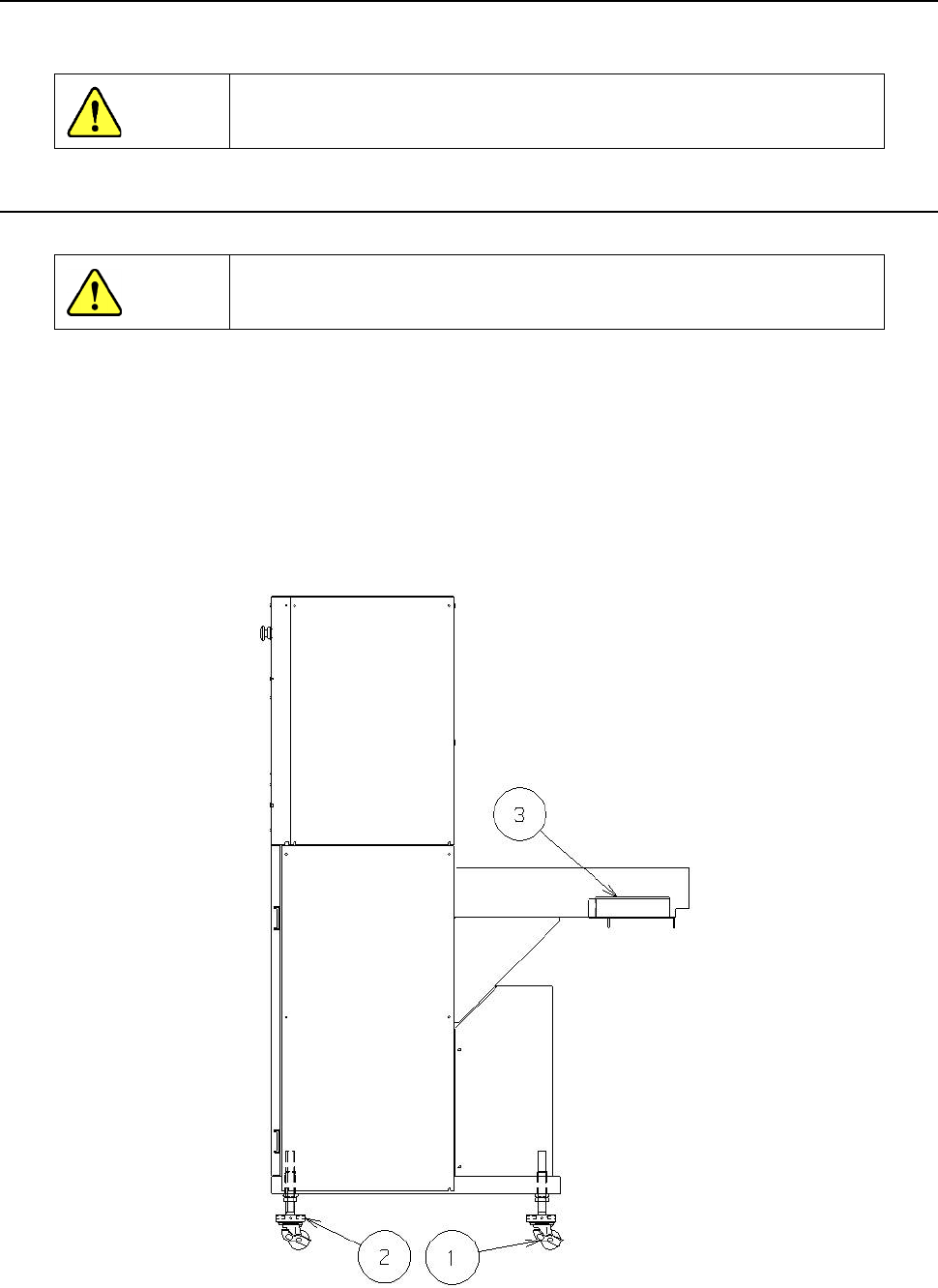 提升脚轮调节器①的 4 处,调整使主机的台架支撑基准面②与本装置的接块③处于相同高度。