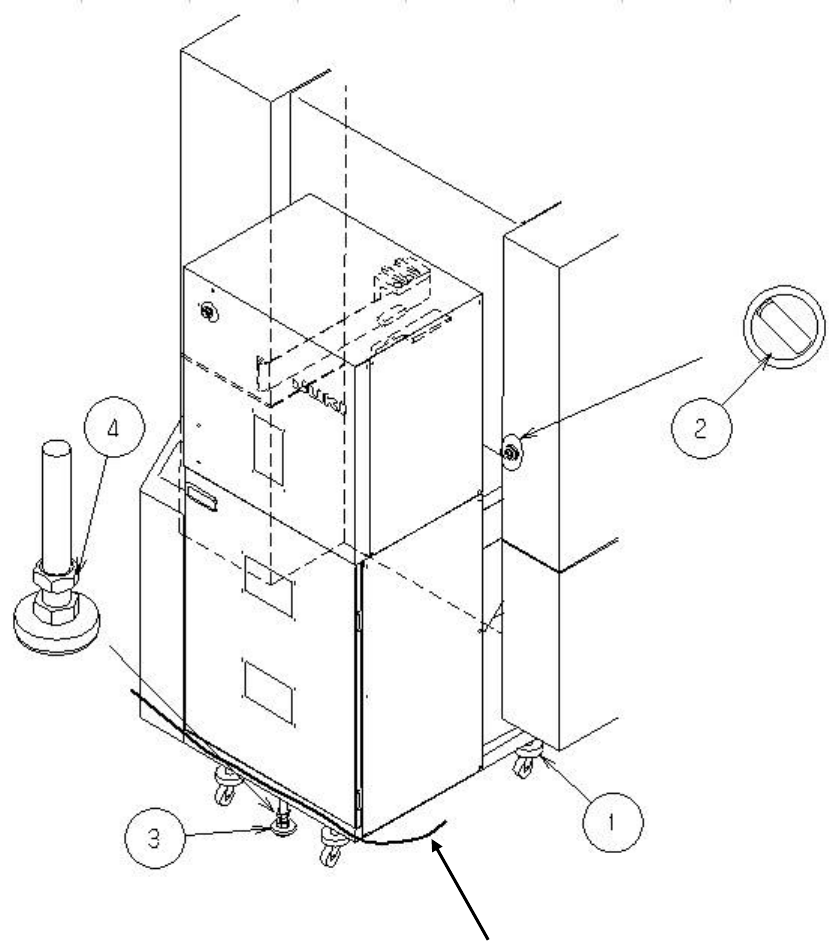 调整水平后,请将脚轮调节器①(2 处)旋回 1 圈,使装置前部下降。
