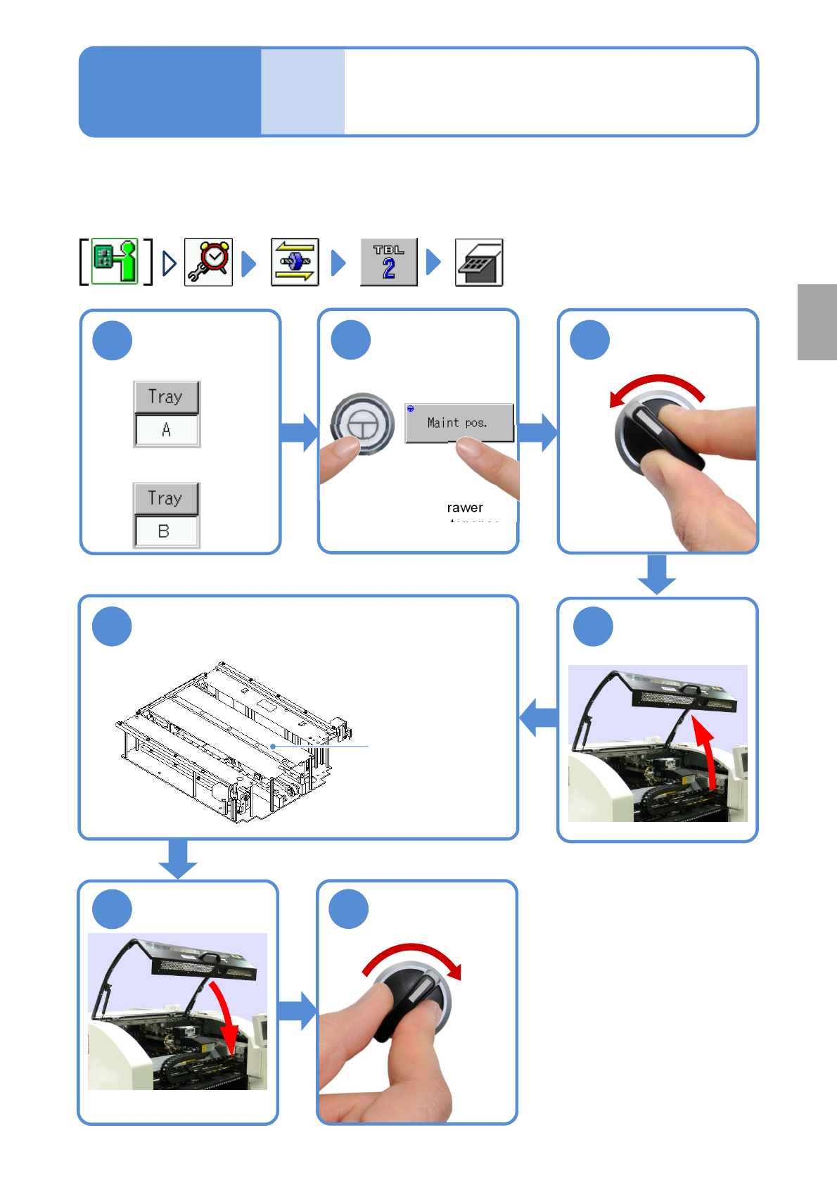NPM-W 2 EJM7DE-MB-05 M-00 5-6 Cleaning the table surface (tray feeder drawer (option)) Maintenance 5-6 Describes cleanin g of the table surf ace of the tray feeder drawer. Tool used: Lint free cloth Time required: 5 minu…