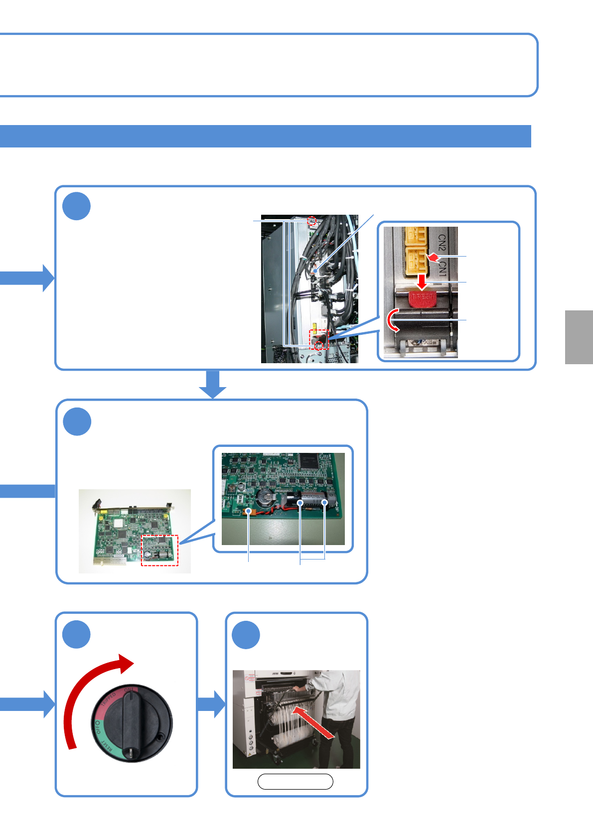 NPM-W 2 EJM7DE-MB-12 M-00 NCIO board 4 ● Disconne ct the cable. ● Loosen the screws securing the NCIO board. ● Pull out the board while holding down the red lock release buttons (PRESS) of the levers at the top and the b…