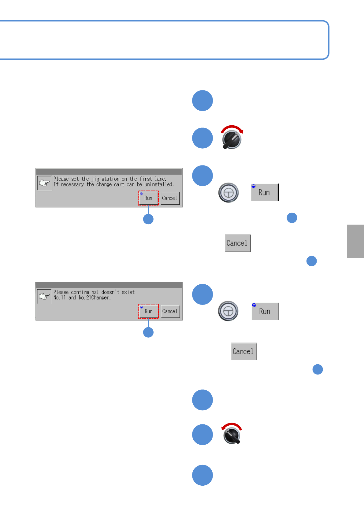 NPM-W 2 EJM7DE-MB-13 M-00 Close the safety cover + Confirm the message ■ To cancel (The screen remains as it is in ) 13-10 -4 Servo switch ON Calibration Open the safety cover Prepare to install nozzles Servo switch OFF …