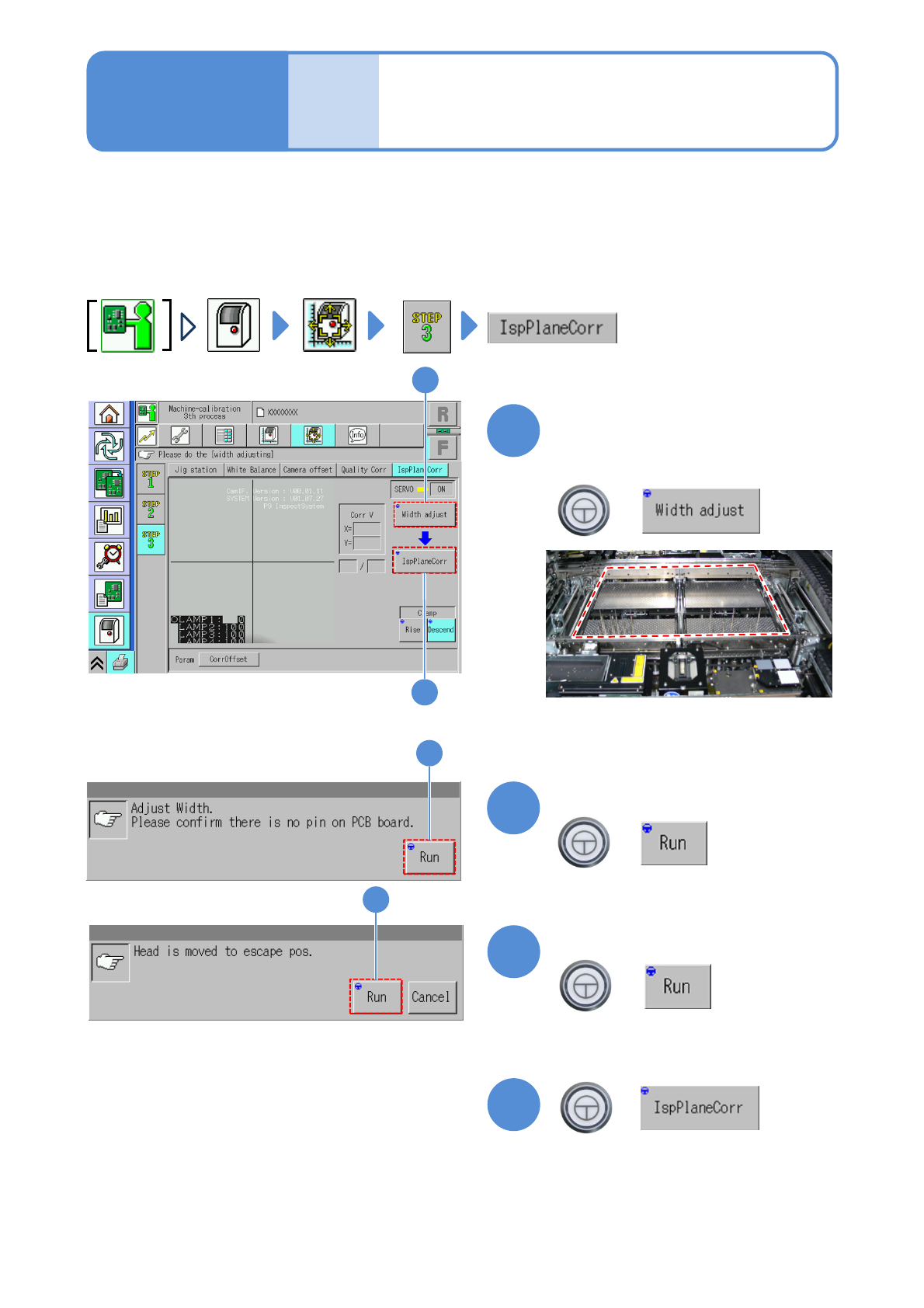 Because the plate correction jig will be manually installed, adjust the transport conveyor width on the pre/post