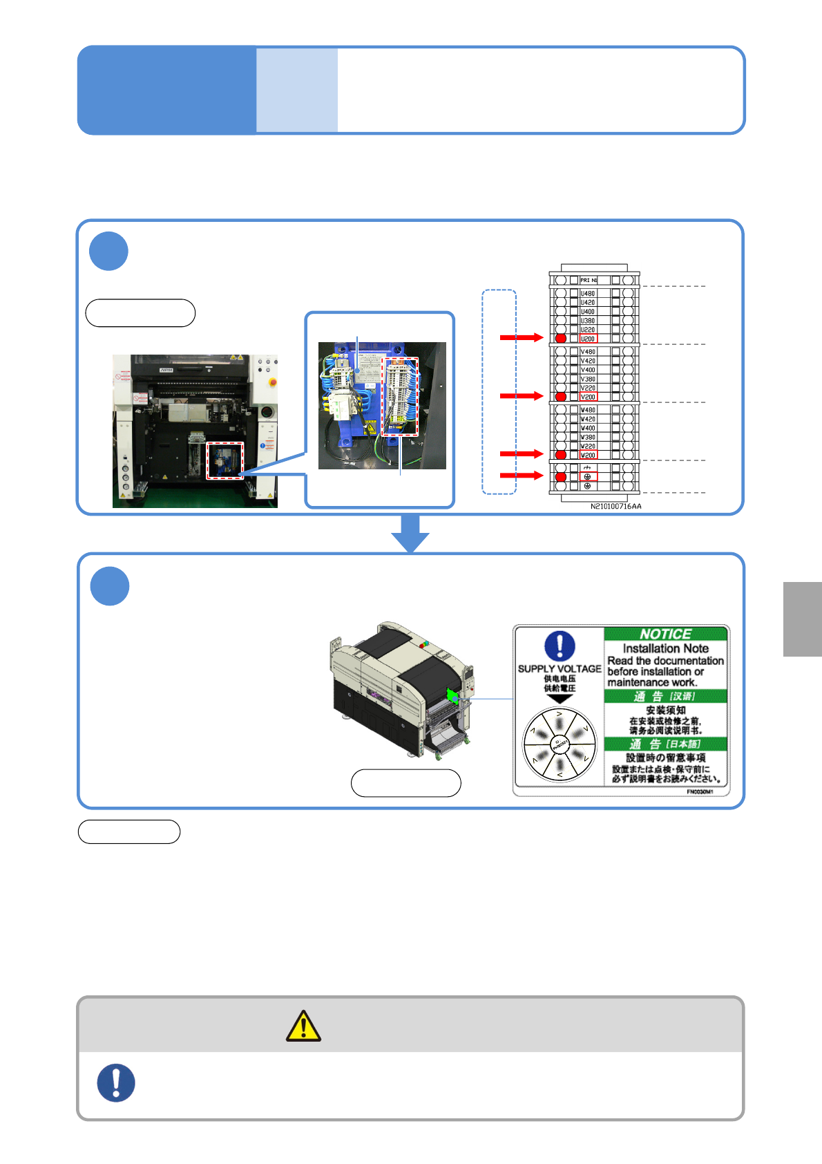 NPM-W 2 EJM7DE-MB-14 M-00 Main power connec- tion Chec king voltages of the primar y po wer supply and the mac hine 14-4-1 Maintenance 14-4-1 Ensure that the voltage settin g of the machine is the same as that of the pla…