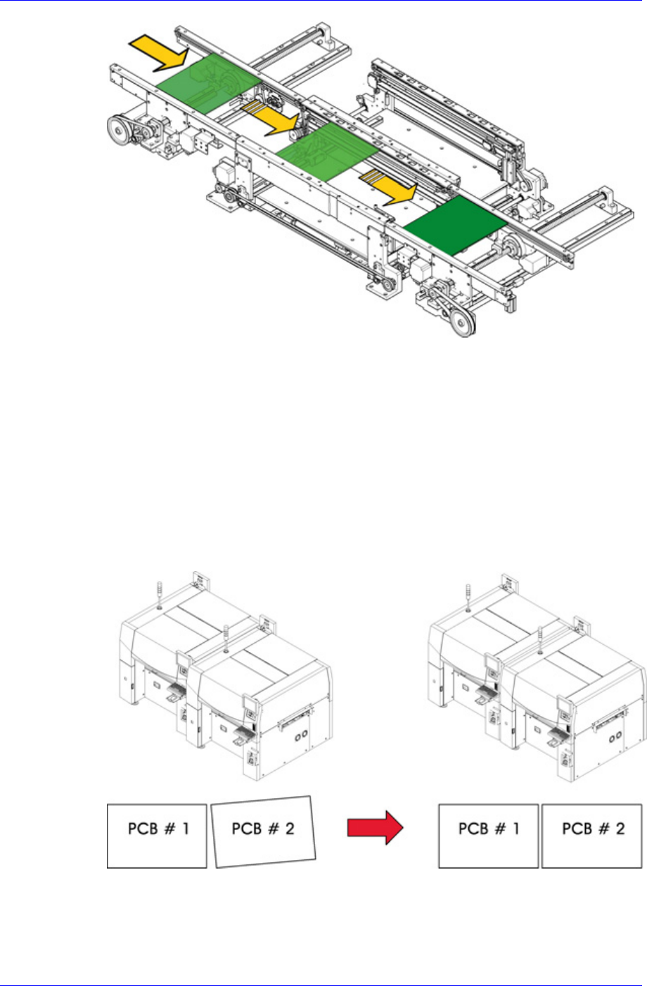 6. 为保证两台设备间的 PCB直线移动,设备必须正确安装,当 PCB紧挨参考线