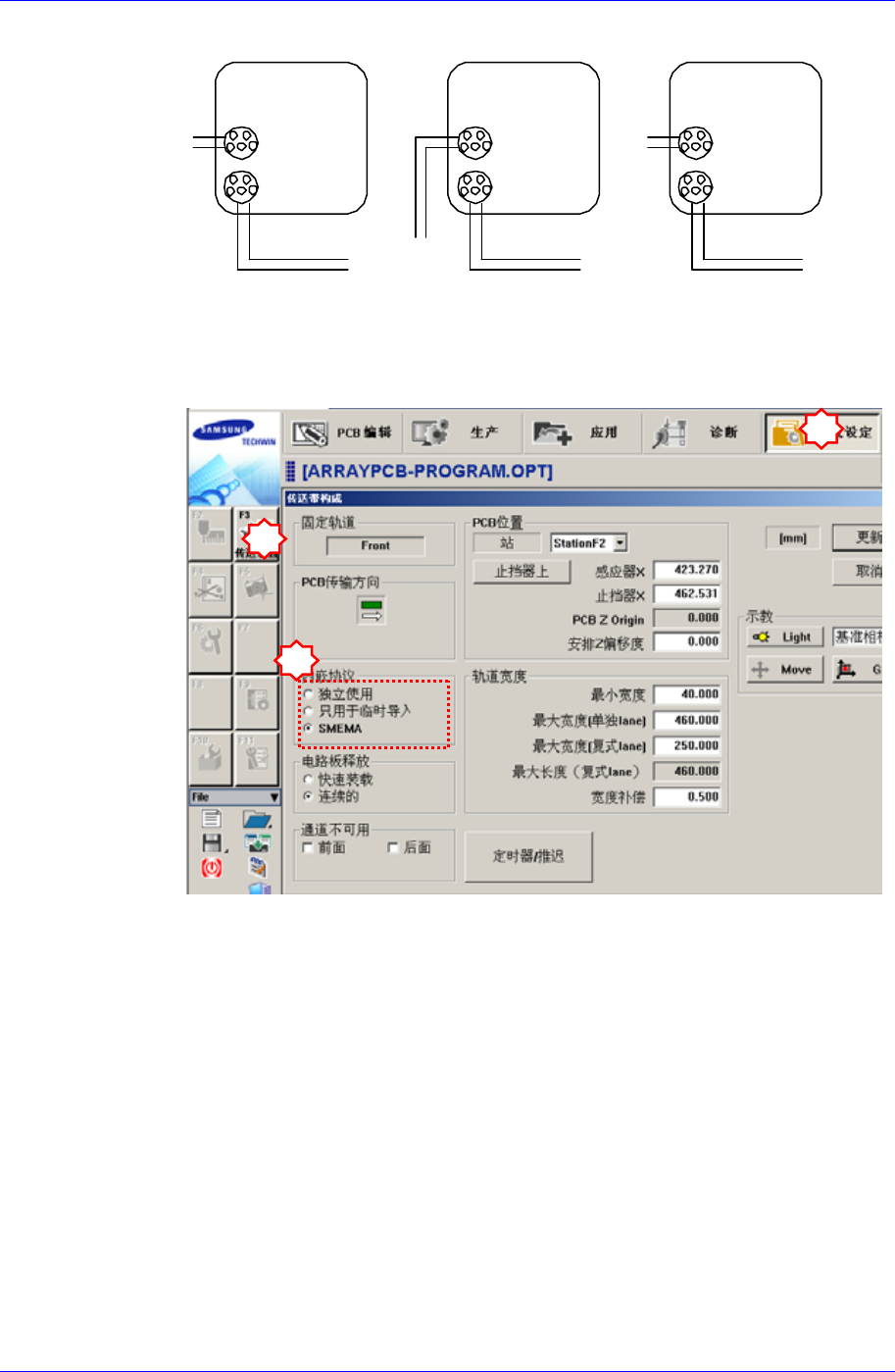 设备安装操作步骤 7-19 1호 기 2호 기 3호 기 ▶▶ PRE V I O US ( I N) NEX T ( O UT) 20 ~ 22V ①② 20 ~ 22V ①② 20 ~ 22V ①② 0~ ∞ Ω ③④ PRE V I O US ( I N) NEX T ( O UT) PRE V I O US ( I N) NEX T ( O UT) 0~ ∞ Ω ③④ 0~ ∞ Ω ③④ 对于规格不符合 SMEMA 代码如 …