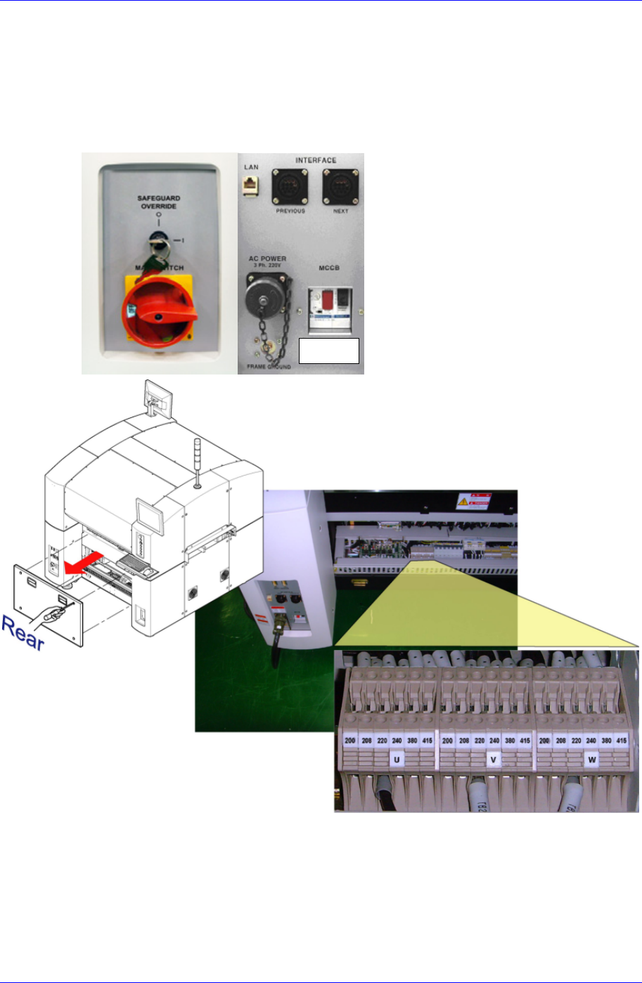 设备的规格 2-3 2.2. 电器规格 2.2.1. 对电源的要求事项 电压 AC 200 ± 18V / 208 ± 19V / 220 ± 20V / 240 ± 22V / 380 ± 25V / 415 ± 2 8V ( 变更变压器的接线方式时 ) 适用于 6 种电压值。 OFF Set up by default at 3 phases and 220V