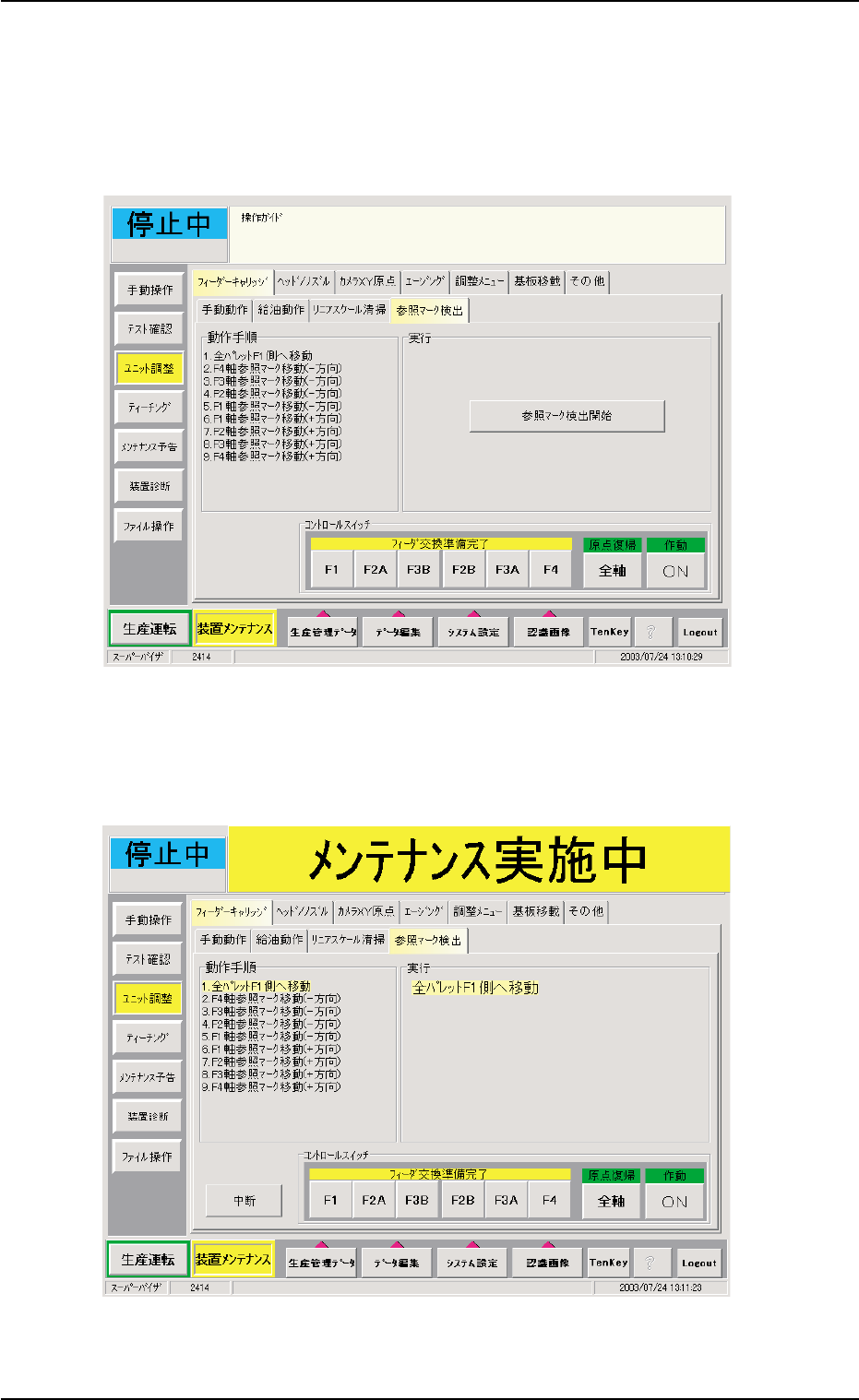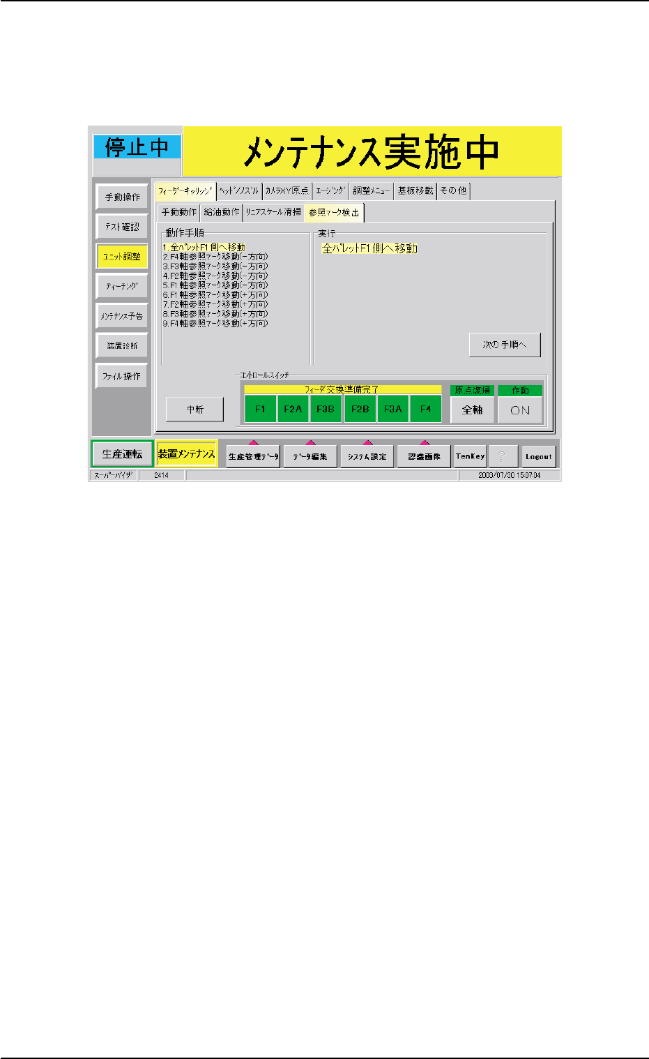 (1 6 ) リニアスケールの参照マークが検出できるかどうか確認しま す。 ( 1 6- 1 ) “フ ィーダキャリッジ” タブシートで [参照マーク検出 ] タ ブを押すと、以下の画面が表示されます。 Fig.4A85- 11 “参照マーク検出” タブシート ( 1 6-2) “参照マーク検出”タブシートで [ 参照マーク検出開始 ] ボ タンを押すと、以下の画面が表示されます。 Fig.4A85- 1 2 1 .4 メンテナンス方法…
