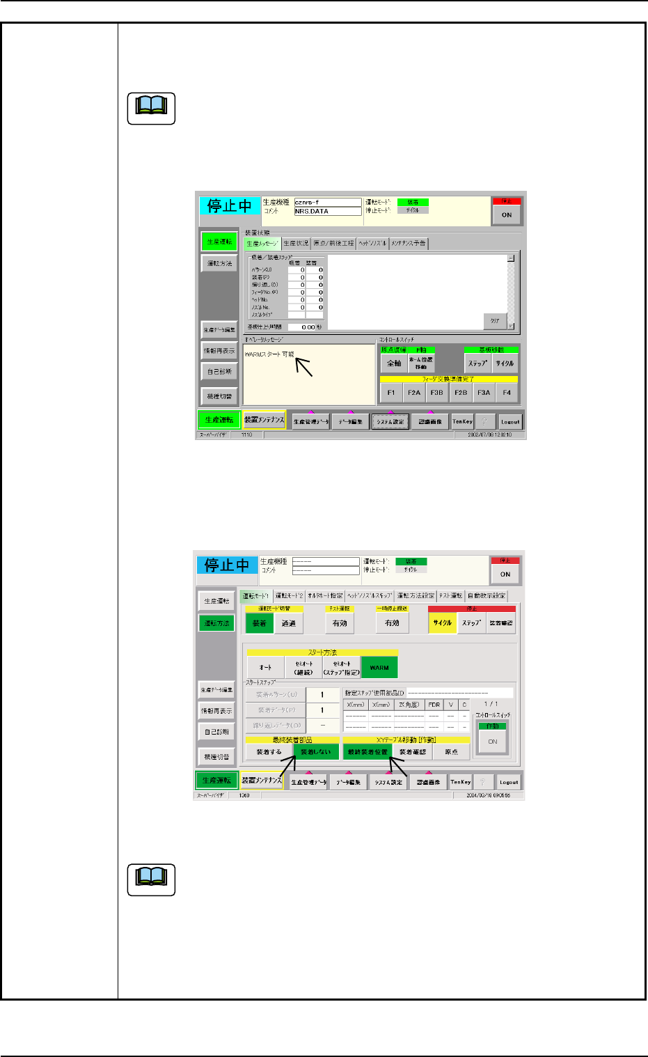 (8) 生産運転画面のオペレータメッセージ欄に、“WARM スタート可能”の